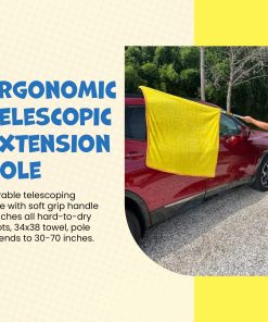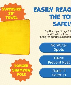 ¡Con la Toalla de Gamuza ShamWow ShamPow XL para Secado Rápido de Autos, podrás secar todo tu auto en menos de 60 segundos! Esta toalla de microfibra súper absorbente viene con bordes Shamwow para un secado sin esfuerzo y sin dejar manchas de agua. Su mango telescópico ergonómico con empuñadura suave te permitirá secar todos los lugares difíciles de alcanzar sin problemas. Además, la Toalla ShamPow XL es segura de usar, ya que no raya la pintura de tu auto y ayuda a prevenir manchas de óxido. Con un tamaño de 34×34 pulgadas, esta toalla con varilla extensible de 30 a 65 pulgadas te facilitará el secado de cualquier vehículo. Las toallas son lavables en lavadora y secadora, siempre utilizando detergente libre de fragancias y evitando el uso de lejía, suavizantes de telas, perfumes o tintes. ¡Haz que el secado de tu auto sea rápido, sencillo y eficaz con la Toalla de Gamuza ShamWow ShamPow XL!