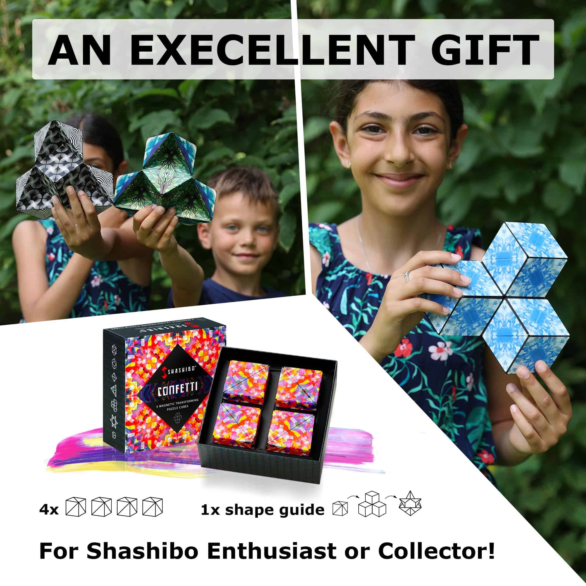 ¡Colecciona los 9 cubos magnéticos shashibo de cambio de forma para infinitas opciones de estructuras! Conecta tantos cubos de rompecabezas Shashibo juntos como quieras para construir esculturas aún más grandes y vibrantes obras de arte en 3D. La actividad STEM y STEAM perfecta y el regalo de cubo mágico magnético para calmar el estrés, estimular los sentidos, y desafiar la mente.