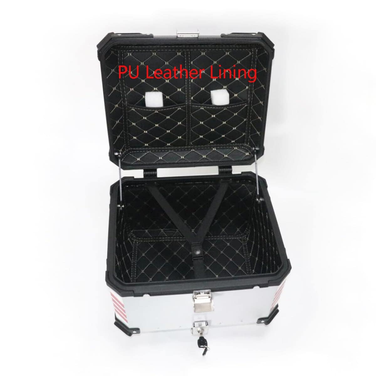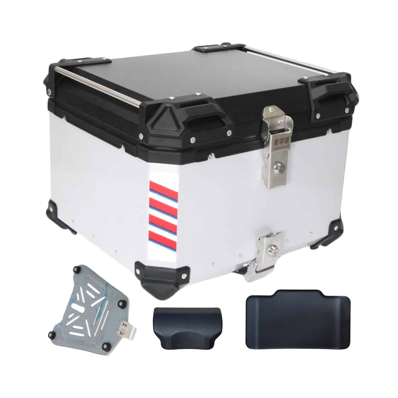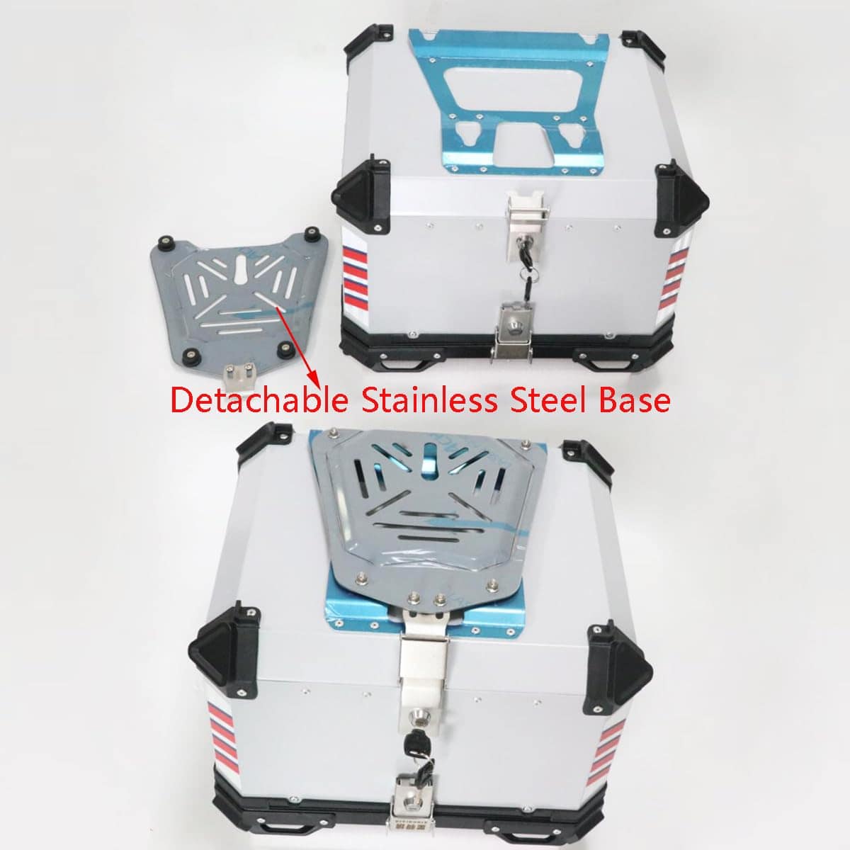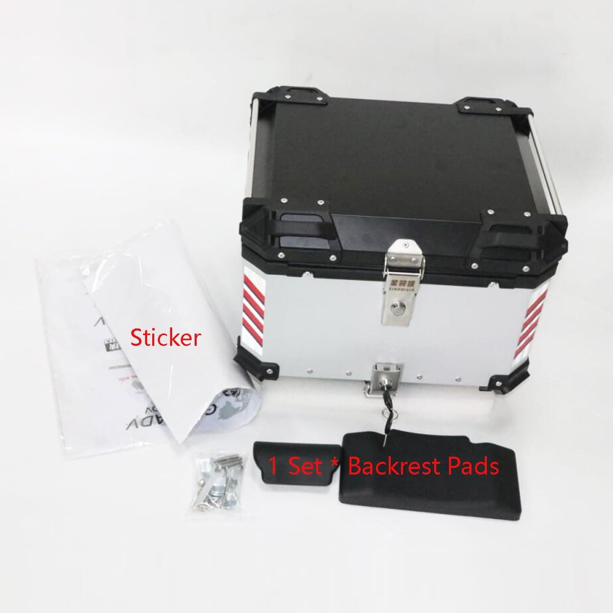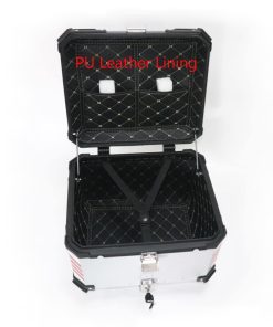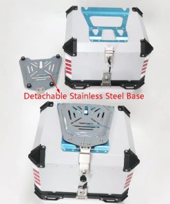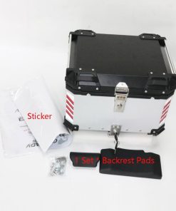 Especificaciones: Color: plata Capacidad: 55L Material: cuerpo de aleación de aluminio con base de acero inoxidable desmontable Diseño: doble cerradura Tamaño: 47 41 35cm Peso: 8.8kg Paquete incluido: 1 Caja Trasera de Moto 1 Base de Acero Inoxidable 1 Juego de Almohadillas de Respaldo 1 Forro de Cuero PU 1 Pegatina Nota: Por favor, tenga en cuenta que la pegatina es un regalo para usted, y puede elegir utilizarla o no.