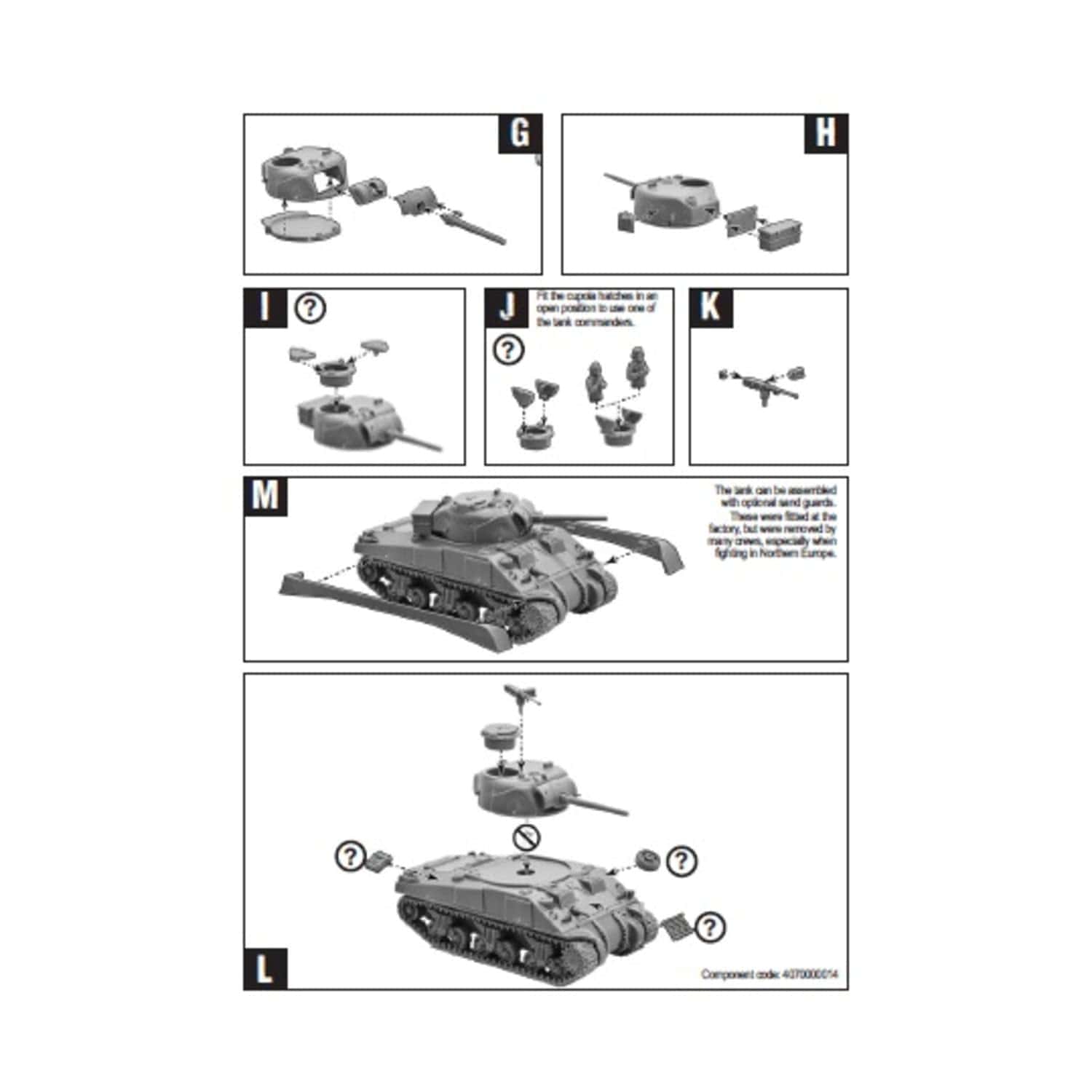 El set de paquete de plástico incluye una tropa de 2 Sherman V y 1 Sherman Vc ‘Firefly’. Al usar las reglas del suplemento Tank War, puedes desplegar esta tropa junto a un pelotón reforzado regular simplemente designando uno como tu vehículo de mando y pagando +25 pts por la especialidad del vehículo de mando.
