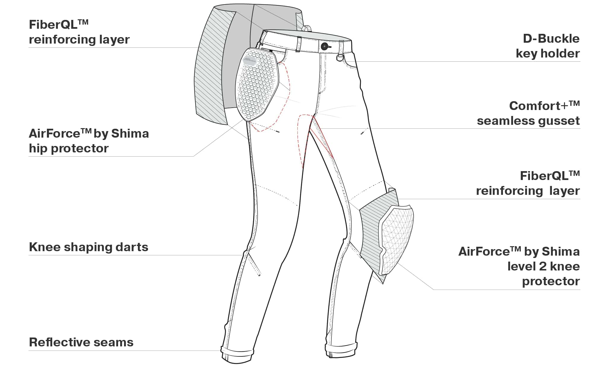 2. PROTECCIÓN: protectores certificados CE AirForce en rodillas y caderas nivel 2, refuerzos resistentes a la abrasión de FibraQL en áreas clave, bolsillos para protectores adicionales de cadera y coxis opcionales.