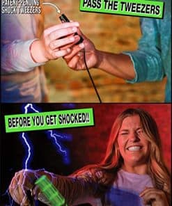 2. ¡Juega este juego de apilar bloques y nunca sabrás cuándo te van a dar un susto! Elige tu nivel de dolor, Zip, Zap, o ShiZap!, luego, elige un bloque, apílalo encima y pasa las pinzas antes de que te den un shock! El juego termina cuando alguien derriba la torre y recibe un shock de penalización, ¡3 segundos de calambrazo para el perdedor!