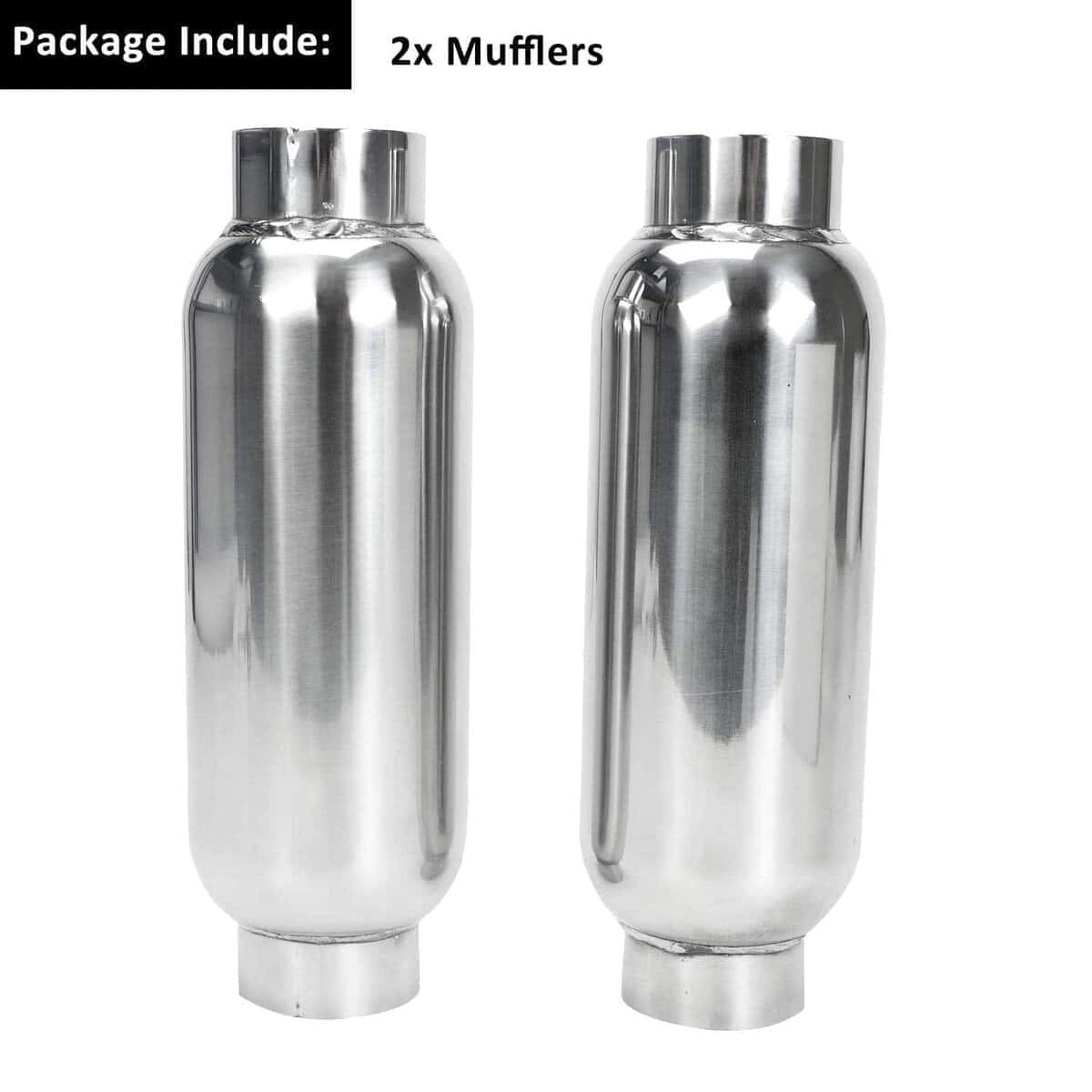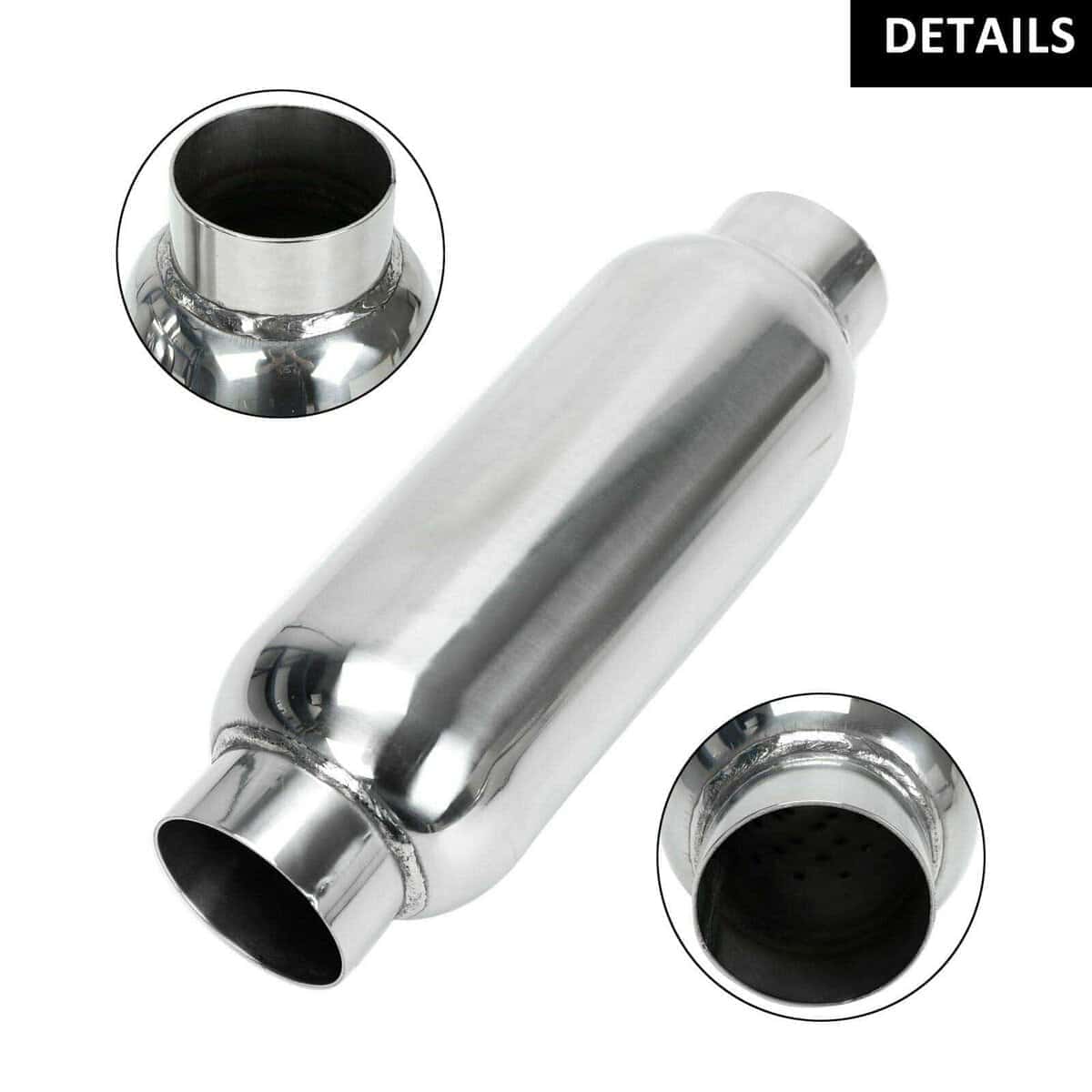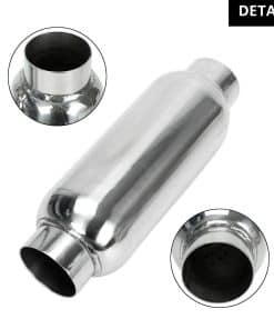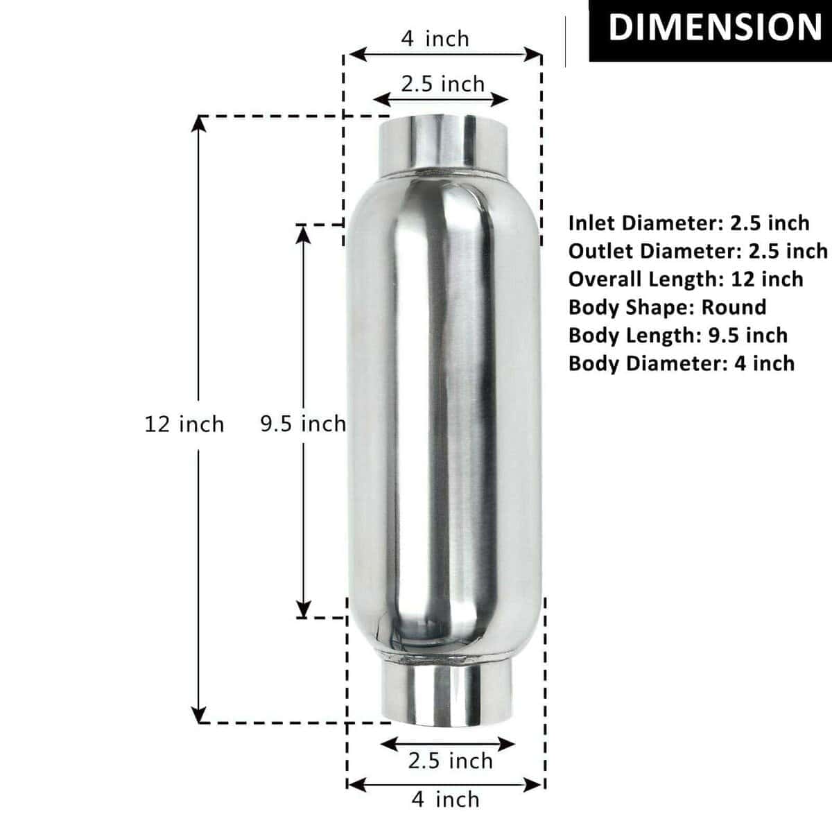 Descripción Description: — 100% Soldadura mecánica, Construcción duradera para una vida útil larga. — Silenciador universal de alto rendimiento. — El acero inoxidable tiene una función protectora, resistencia a la corrosión y resistencia al calor. — Núcleos perforados de paso recto para el flujo más alto posible. — Diseñado para amortiguar el ruido del escape, Facilita el flujo ininterrumpido del escape. El silenciador que era más silencioso con un tono suave. — Se recomienda una instalación profesional – No se incluye instrucciones Especificación – Longitud total: 12 pulgadas – Forma del cuerpo: Redonda – Longitud del cuerpo: 9.5 pulgadas – Diámetro del cuerpo: 4 pulgadas – Diámetro de entrada: 2.5 pulgadas – Diámetro de salida: 2.5 pulgadas – Tipo de conexión de entrada y salida: Conexión de tubería – Material del silenciador: Acero inoxidable Paquete Incluido: — 2x Silenciadores — Como se muestra en la imagen de arriba