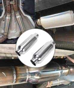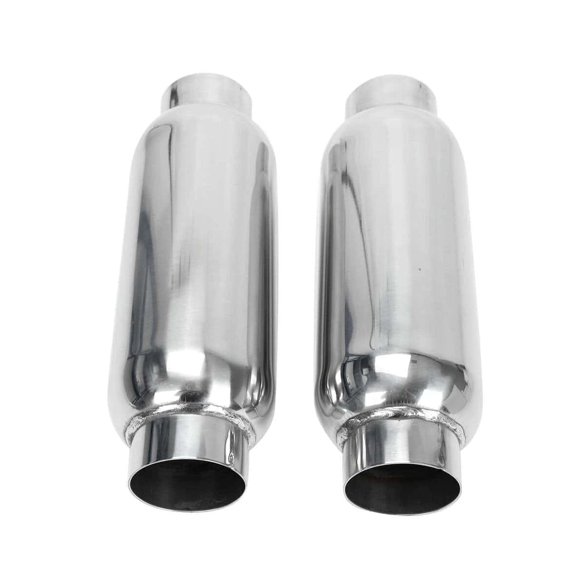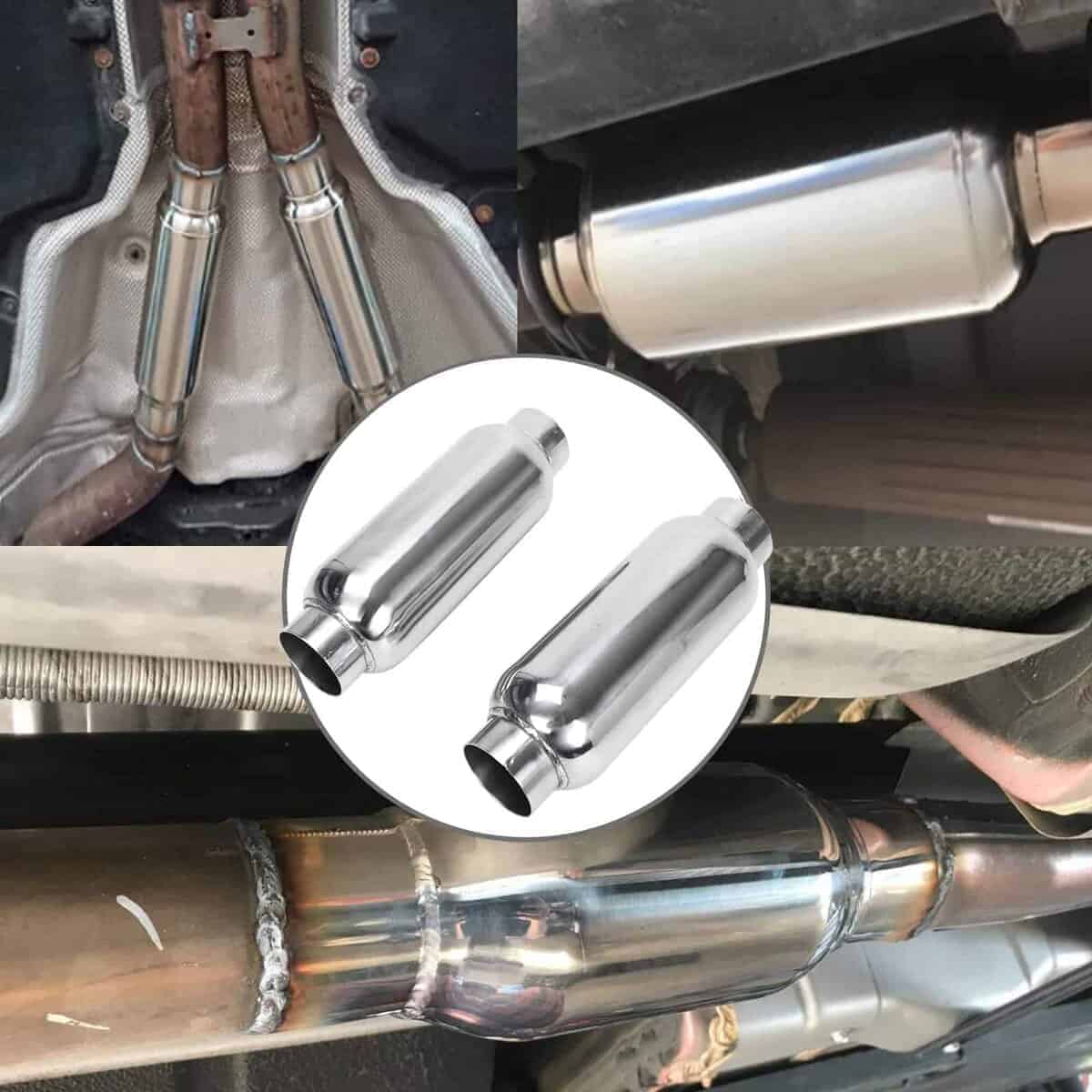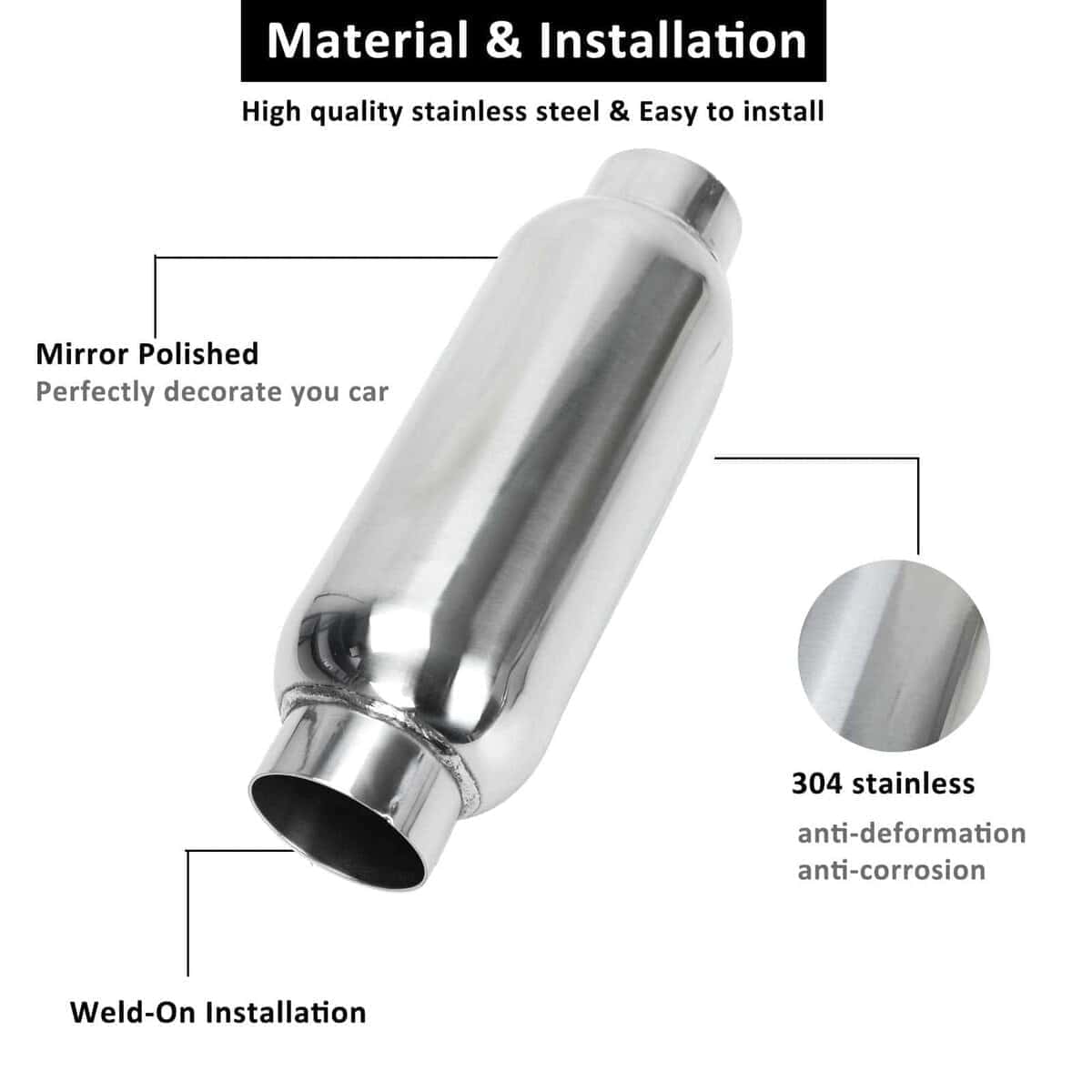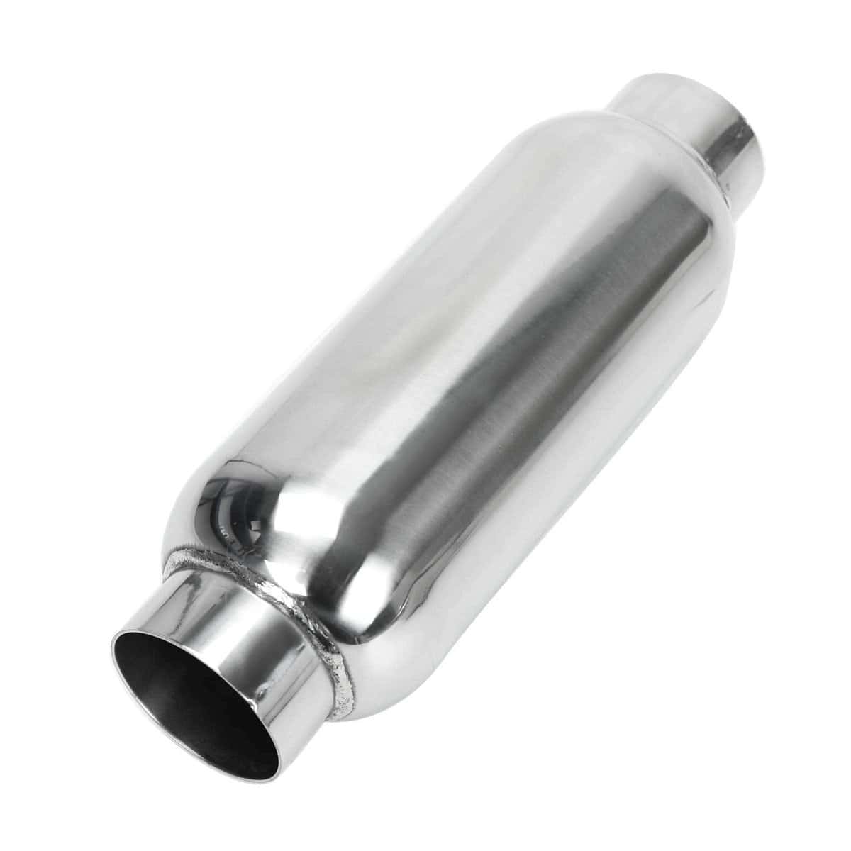 Descripción Description: — 100% Soldadura mecánica, Construcción duradera para una vida útil larga. — Silenciador universal de alto rendimiento. — El acero inoxidable tiene una función protectora, resistencia a la corrosión y resistencia al calor. — Núcleos perforados de paso recto para el flujo más alto posible. — Diseñado para amortiguar el ruido del escape, Facilita el flujo ininterrumpido del escape. El silenciador que era más silencioso con un tono suave. — Se recomienda una instalación profesional – No se incluye instrucciones Especificación – Longitud total: 12 pulgadas – Forma del cuerpo: Redonda – Longitud del cuerpo: 9.5 pulgadas – Diámetro del cuerpo: 4 pulgadas – Diámetro de entrada: 2.5 pulgadas – Diámetro de salida: 2.5 pulgadas – Tipo de conexión de entrada y salida: Conexión de tubería – Material del silenciador: Acero inoxidable Paquete Incluido: — 2x Silenciadores — Como se muestra en la imagen de arriba