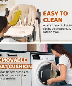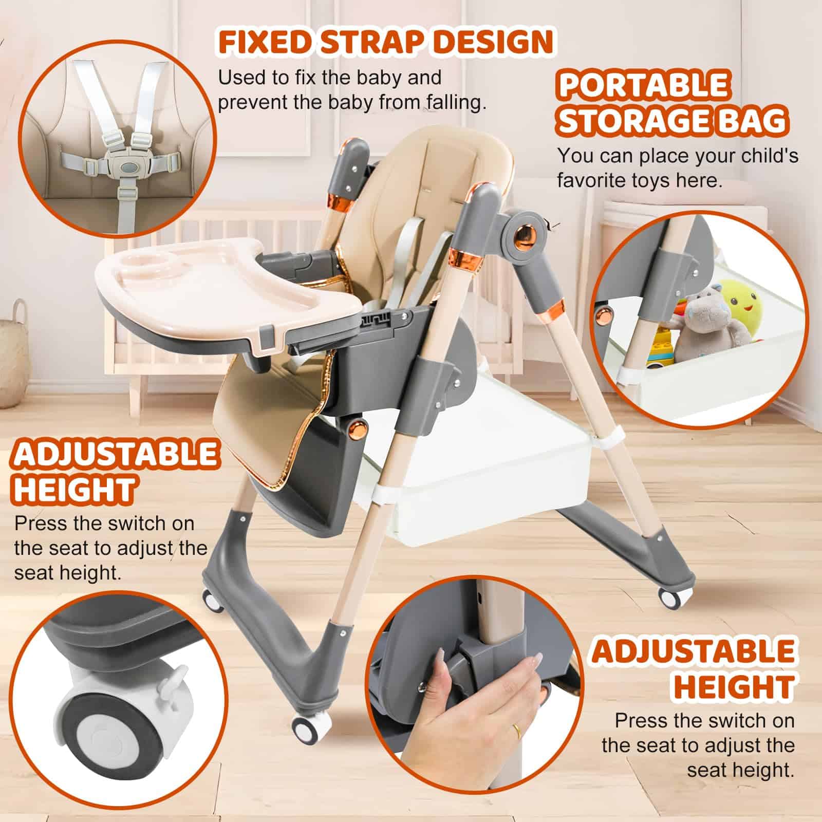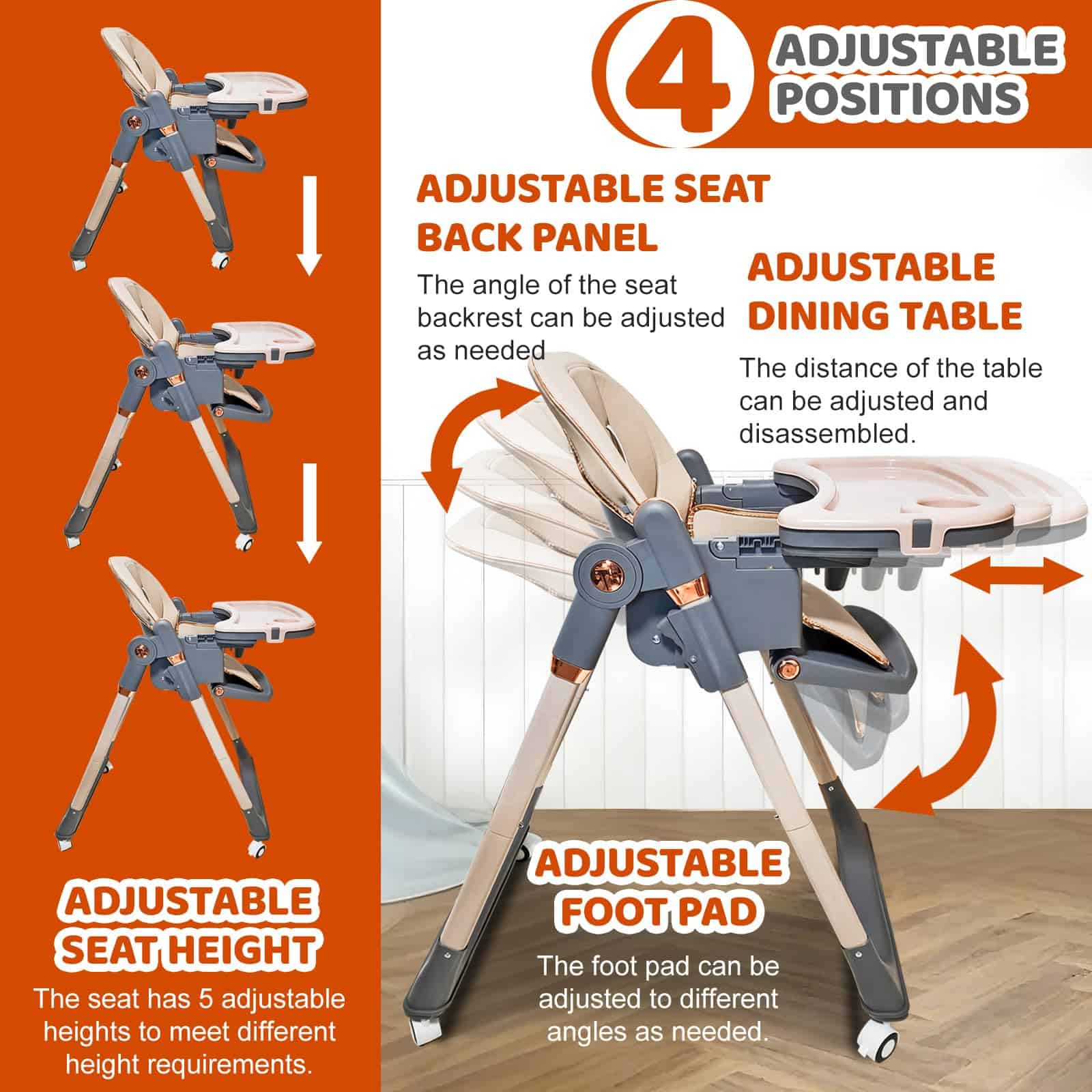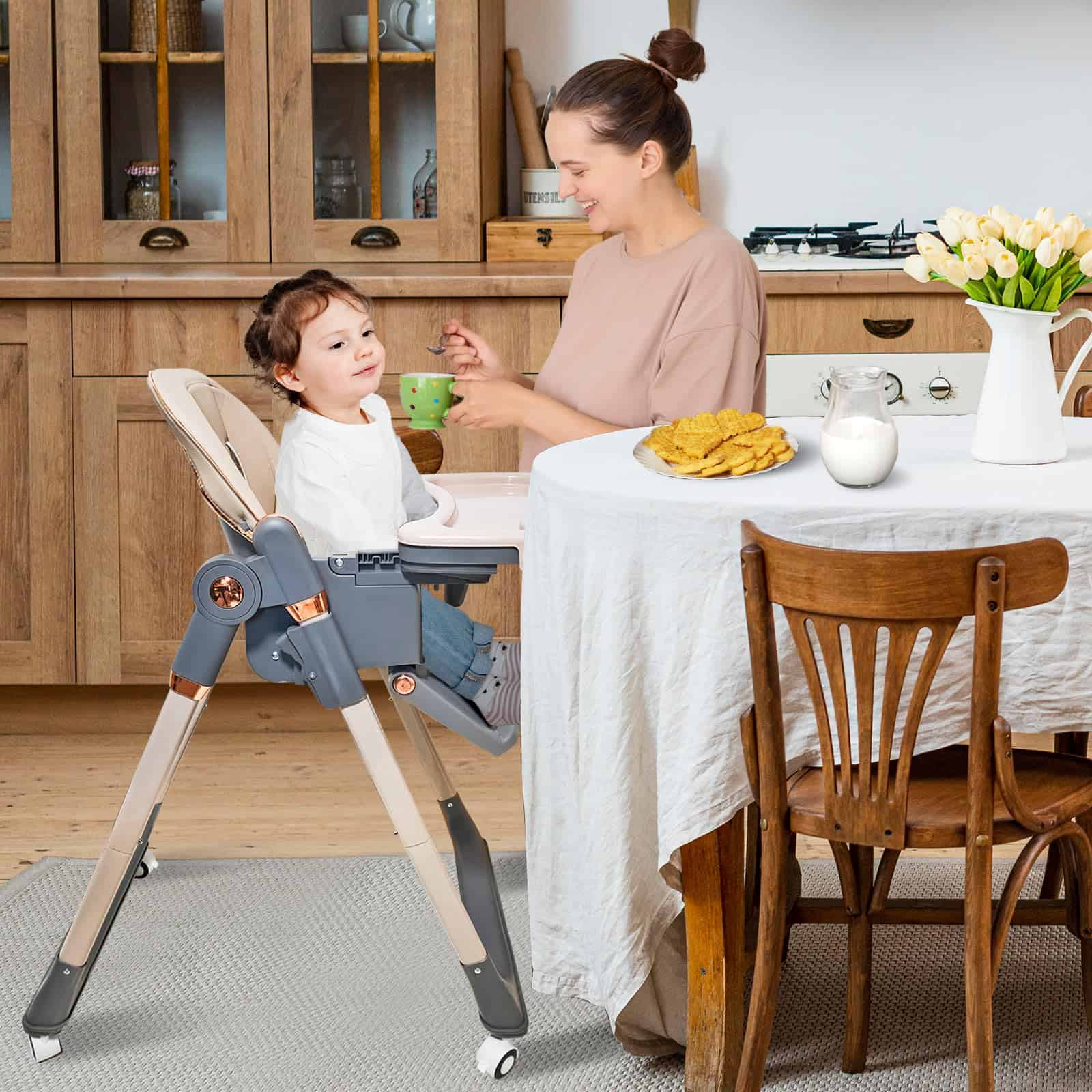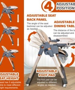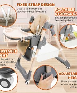 1. La Silla Alta con ruedas giratorias de 360 grados puede llevar fácilmente al bebé a tu lado. Las ruedas están equipadas con bloqueos, que se pueden bloquear durante las comidas. 2. La Silla Alta para Bebés tiene 4 ajustes de postura para sentarse para satisfacer las necesidades de los bebés en diferentes etapas, y 5 ajustes de altura para adaptarse a varias mesas de comedor, permitiendo a los bebés participar plenamente en las comidas familiares. 3. Las características de la Silla Alta Plegable hacen que sea pequeña en tamaño, ligera en peso y fácil de llevar cuando salga. 4. Los asientos de la Silla Alta para Niños son fáciles de limpiar, los platos son desmontables y también se pueden colocar en el lavavajillas para limpiarlos. 5. La Silla para Bebés viene con un cinturón de seguridad, liberando las manos de los padres y eliminando la necesidad de preocuparse por que su bebé se caiga.