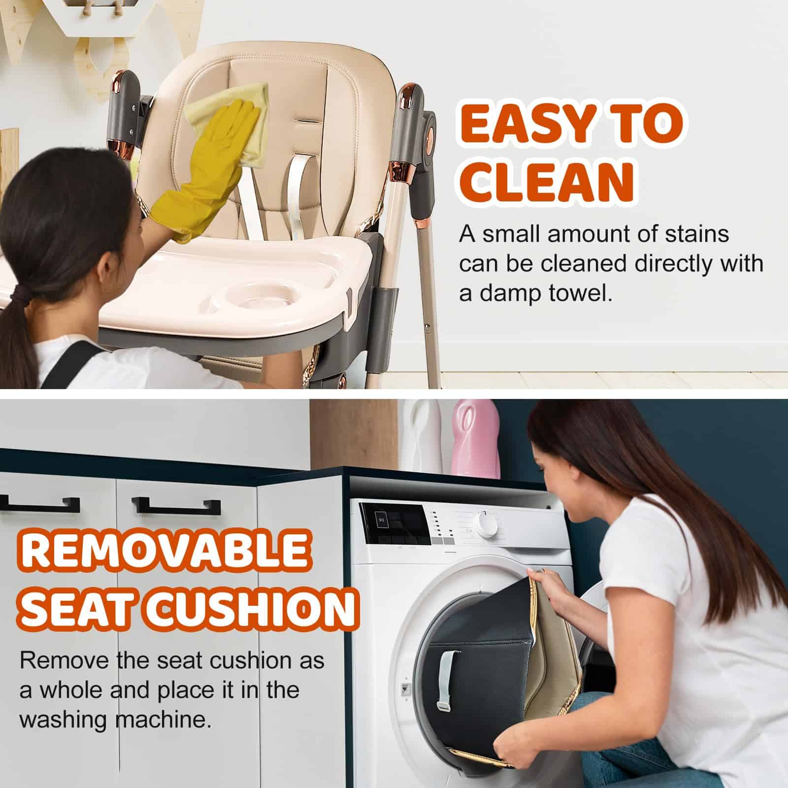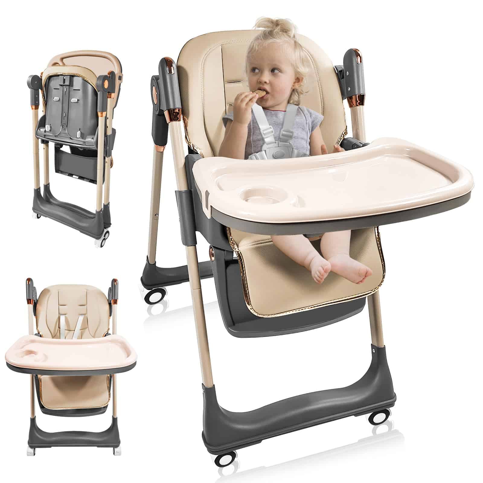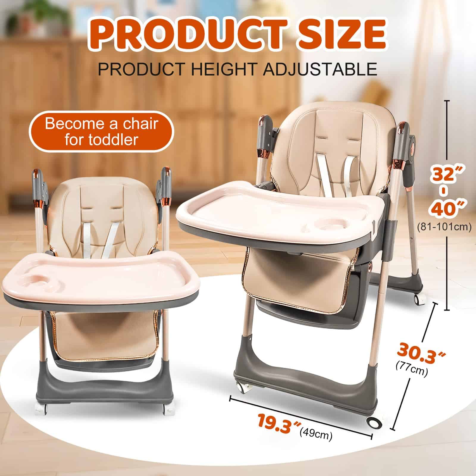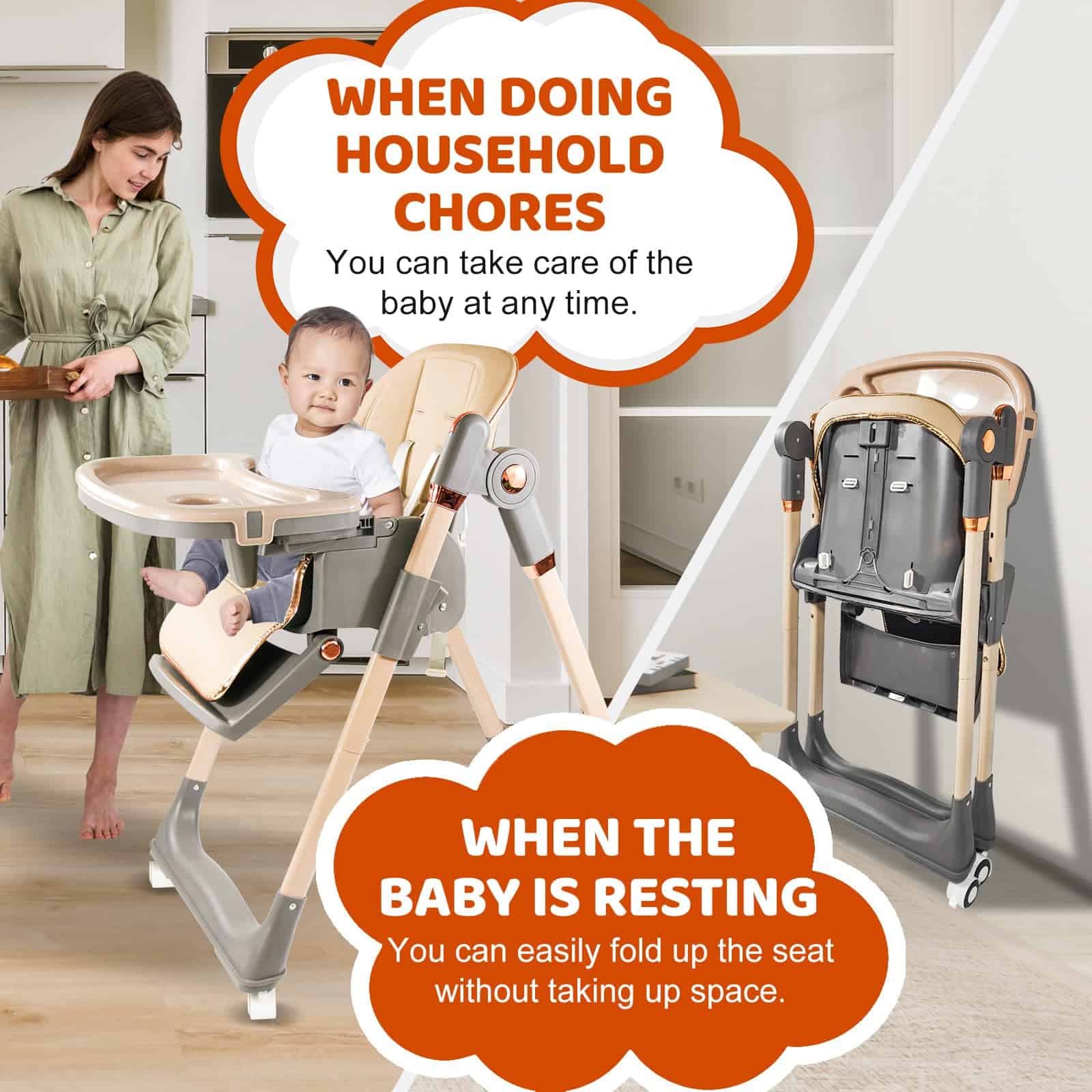 1. La Silla Alta con ruedas giratorias de 360 grados puede llevar fácilmente al bebé a tu lado. Las ruedas están equipadas con bloqueos, que se pueden bloquear durante las comidas. 2. La Silla Alta para Bebés tiene 4 ajustes de postura para sentarse para satisfacer las necesidades de los bebés en diferentes etapas, y 5 ajustes de altura para adaptarse a varias mesas de comedor, permitiendo a los bebés participar plenamente en las comidas familiares. 3. Las características de la Silla Alta Plegable hacen que sea pequeña en tamaño, ligera en peso y fácil de llevar cuando salga. 4. Los asientos de la Silla Alta para Niños son fáciles de limpiar, los platos son desmontables y también se pueden colocar en el lavavajillas para limpiarlos. 5. La Silla para Bebés viene con un cinturón de seguridad, liberando las manos de los padres y eliminando la necesidad de preocuparse por que su bebé se caiga.