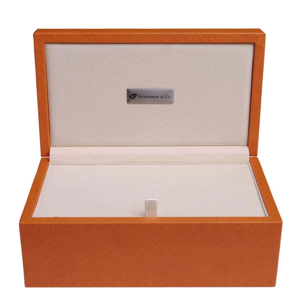 Dominós tan hermosos requieren algo más que una caja de almacenamiento ordinaria. Silverman & Co. han creado una caja de almacenamiento de estilo joyería única que no solo se ve impresionante, sino que también está diseñada para mantener estos dominós bien protegidos después de jugar. Como se ve en las fotos de arriba, cada capa de dominós está dividida por un separador de fieltro grueso y liso para mayor tranquilidad.