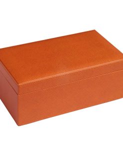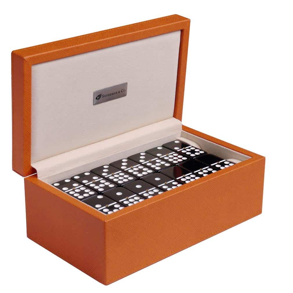 Este set de dominós Doble 9 viene en un estuche de piel naranja y contiene 55 dominós negros con giradores.