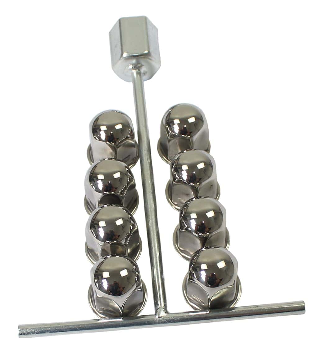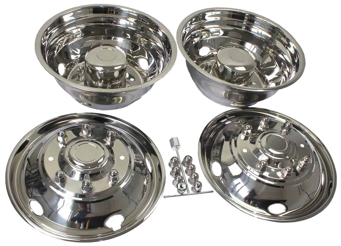 Simuladores de rueda de acero inoxidable XIUHUA de 19.5 pulgadas con 8 birlos para camión Ford F450 F550 2003-2004. Este juego de simuladores de ruedas está construido en acero inoxidable 304 con un acabado espejo muy agradable que garantiza durabilidad a largo plazo. Su estilo de montaje sobre los birlos facilita la instalación, y viene completo con 2 cubiertas de rueda delanteras, 2 cubiertas de rueda traseras, 8 cubiertas de tuerca de birlo con tuercas de jamón y 1 herramienta de instalación. Con un tamaño de 19.5 pulgadas, 8 birlos y 5 agujeros para la mano, este juego es compatible con camiones Ford F450 F550 fabricados entre 2003 y 2004.
