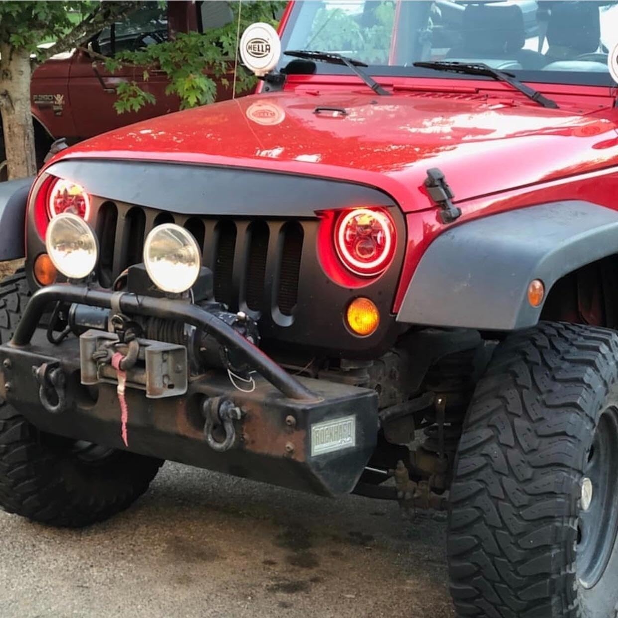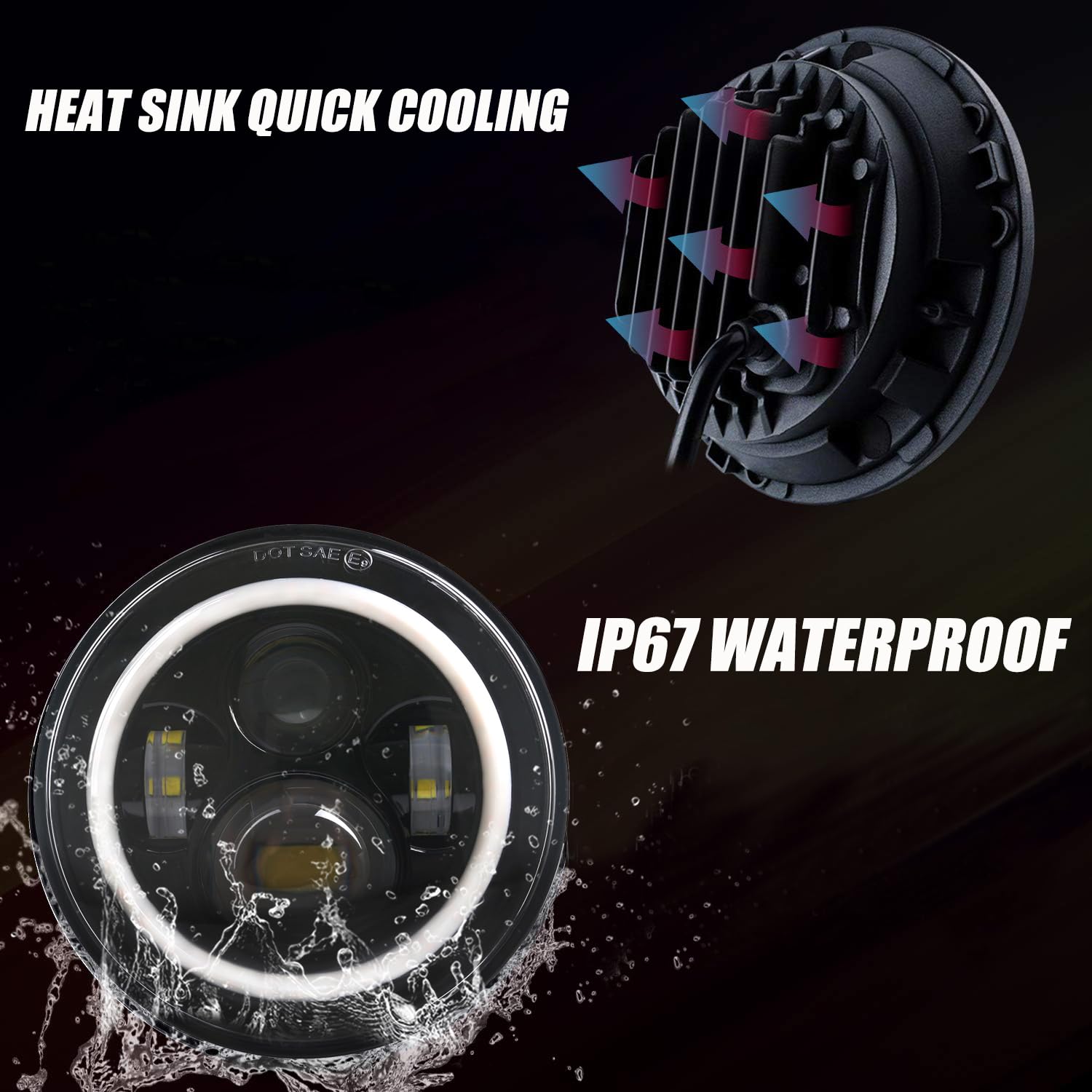 1. Faro de 7 pulgadas con anillo halo rojo fabricado en aleación de aluminio fundido, alta conductividad térmica, lente de PC, a prueba de golpes, resistente al agua IP67, orificio especial de respiración para liberar la humedad, mayor tiempo de vida útil, puede funcionar en cualquier condición climática adversa; Los faros LED realmente iluminan la carretera para una conducción más segura y añaden un nuevo aspecto afilado al frente del vehículo.