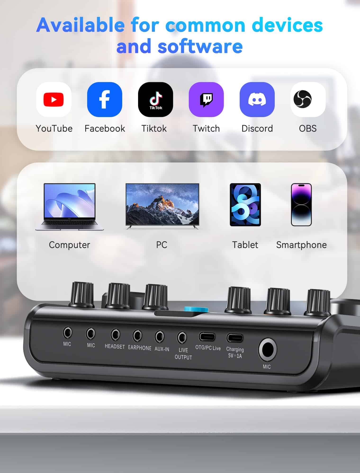 4. Gran Compatibilidad Compatible con la mayoría del software, incluidos OBS Studio, Discord, Twitch, TikTok, YouTube, Facebook, Streamlabs, Streamyard y Zoom, facilitando la grabación y streaming. El Equipo para Podcast P99 también es compatible con la mayoría de las laptops, PCs, Windows, macOS, smartphones y tablets, y admite hasta 2 dispositivos y 2 plataformas simultáneamente. Nota: puede ser necesario un adaptador OTG para smartphones sin jack de 3.5mm (no incluido).
