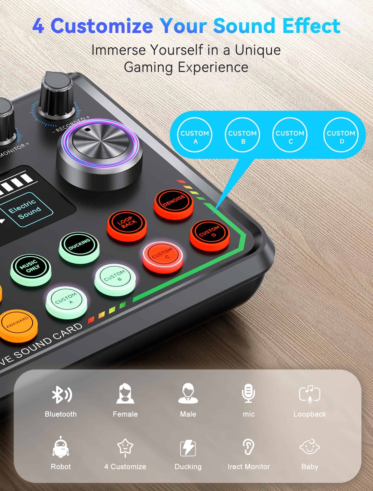 2. Funciones de Audio Avanzadas Disfruta de 4 efectos de sonido personalizables y 5 efectos de audio especiales integrados, junto con auto-tune de 12 pasos y tonos ajustables (Agudos, Medios, Graves). El paquete te permite modificar tu voz con 5 transformaciones únicas, desde tonos masculinos y femeninos hasta divertidos sonidos de monstruos, mejorando tus posibilidades creativas.