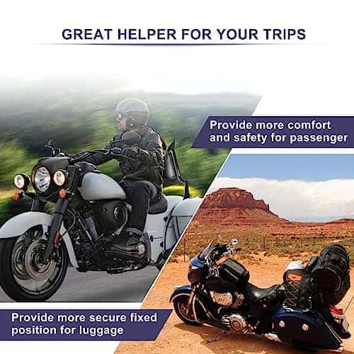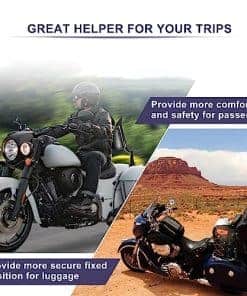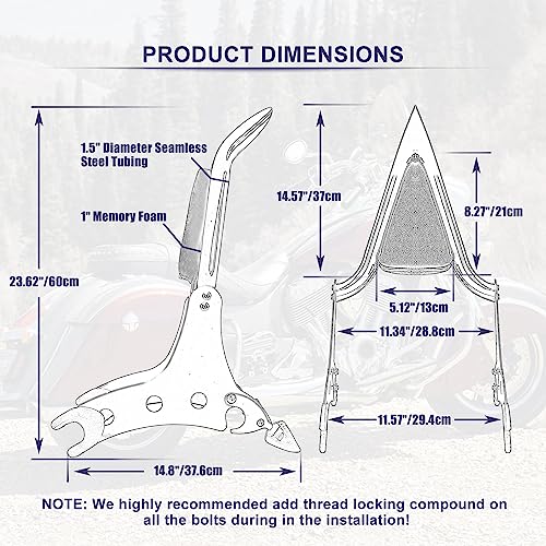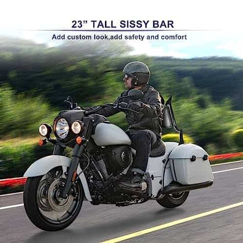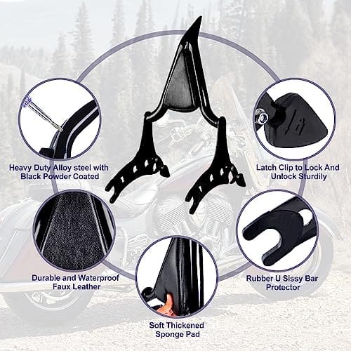 Sissy Bar desmontable para pasajero, se ajusta a los modelos Indian Chieftain Roadmaster Springfield Challenger 2014-2024. Fabricado en acero de aleación de alta calidad para soportar cargas pesadas. Recubierto de polvo negro brillante para resistir al desgaste y la corrosión. Incluye un cojín de espuma de alta densidad para mayor comodidad durante largos paseos. Diseño ergonómico que inclina hacia atrás 15 grados para mayor espacio. Fácil de instalar y limpiar. Aporta un estilo personalizado y proporciona seguridad y protección contra el viento y la lluvia.
