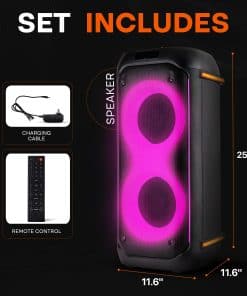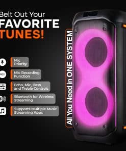El sistema de altavoces de fiesta compacto con bluetooth es la solución perfecta para la entretención en cualquier reunión, combinando un sonido potente y características emocionantes en un paquete compacto y portátil. Con altavoces duales de 6.5′ de dos vías, este sistema de PA de 160W ofrece un audio rico y de rango completo que llena cualquier espacio, ideal para noches de karaoke, fiestas o eventos al aire libre. El bluetooth integrado permite la transmisión inalámbrica sin problemas desde cualquier dispositivo, mientras que múltiples opciones de entrada incluyendo USB, micro SD y radio FM aseguran que tengas formas versátiles de disfrutar tu música favorita. Las dinámicas luces LED, que se sincronizan con el ritmo, crean una atmósfera de fiesta envolvente que a tus invitados les encantará. Diseñado tanto para la diversión como para la funcionalidad, esta máquina de karaoke está equipada con una batería recargable incorporada que ofrece de 2 a 8 horas de reproducción, dependiendo del volumen. Cuenta con un diseño de gabinete robusto moldeado con un asa resistente para un transporte fácil, haciéndolo perfecto para uso en interiores y exteriores. La función Mic Priority garantiza voces claras, ajustando automáticamente el audio para una claridad óptima. Controles adicionales de graves, agudos, eco y volumen de micrófono te dan la capacidad de afinar tu sonido. Este sistema también incluye un bolso protector para altavoces, para que puedas transportarlo y almacenarlo fácilmente sin preocupaciones. Ya sea que estés organizando una fiesta o practicando tus habilidades de canto, este altavoz de fiesta con capacidades inalámbricas bluetooth es la elección definitiva para un sonido de calidad y comodidad.