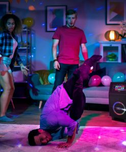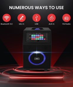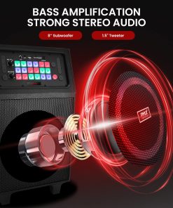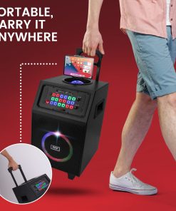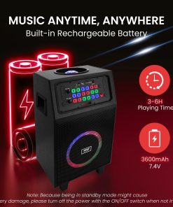 Altavoz portátil de karaoke con sistema True Wireless Stereo, altavoz de alta potencia, transmisión de música inalámbrica Bluetooth, incluye micrófono inalámbrico para diversión de karaoke, luces LED multicolores intermitentes, radio FM con pantalla LED digital, batería recargable integrada, entrada auxiliar (3.5mm), soporte de archivo de audio digital MP3, conecte y transmita audio desde dispositivos externos, lector de memoria USB Flash Drive, lector de tarjeta Micro SD, entrada de 1/4 para micrófono, manejar portado para respuesta extendida de graves, ajuste de rendimiento de sonido agudo y grave, carro y ruedas convenientes, botón X-Bass para bajos más potentes, selección de muchos tipos de efectos de sonido DJ para más diversión, perfecto para visitas al patio trasero o al parque, fiesta instantánea en cualquier momento y en cualquier lugar.