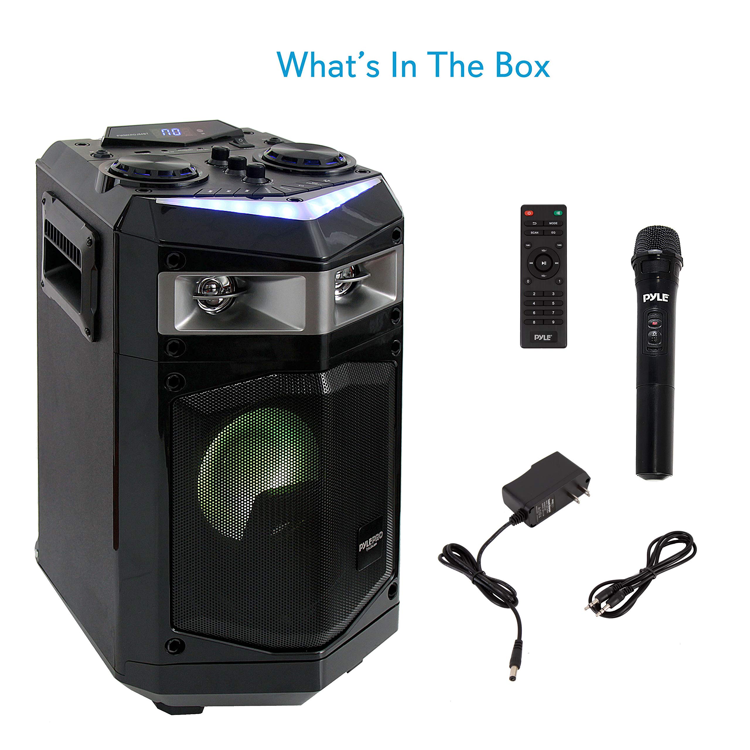 Altavoz PA Portátil y Sistema de Micrófono Conectividad BT Altavoz de Karaoke Compacto, Portátil y Potente Luces de Fiesta DJ Parpadeantes Pulse y Baile al Ritmo Crea Tu Propia Banda Sonora con Música + Vocales Incluye Micrófono de Mano Reproducción de Archivos de Audio Digital MP3 a través de Lectores USB/ Micro SD Función de Grabación de Archivos de Audio Prioridad de Micrófono, Modo Talkover de Micrófono Centro de Control de Botones en el Panel Superior Radio FM con Pantalla LCD Digital Función de Grabación de Archivos de Audio Jack para Auriculares, Entrada Auxiliar de 3.5 mm (2) Entradas de Micrófono de 1/4 de pulgada Conecta y Transmite desde Dispositivos Externos Reproducción de Sonido Estéreo de Gama Completa Impresionante Respuesta de Graves Diseño Robusto y Resistente Conectividad BT Incorporada para Transmisión Emparejamiento Simple y sin Problemas Funciona con Todos los Dispositivos Actuales (Smartphone, Tableta, Computadora Portátil, Computadora, etc.) Versión de Conectividad BT: 2.0 Nombre de la Red de Conectividad BT: ‘PyleUSA Contraseña de Conexión BT: ‘0000’ (4 Ceros)