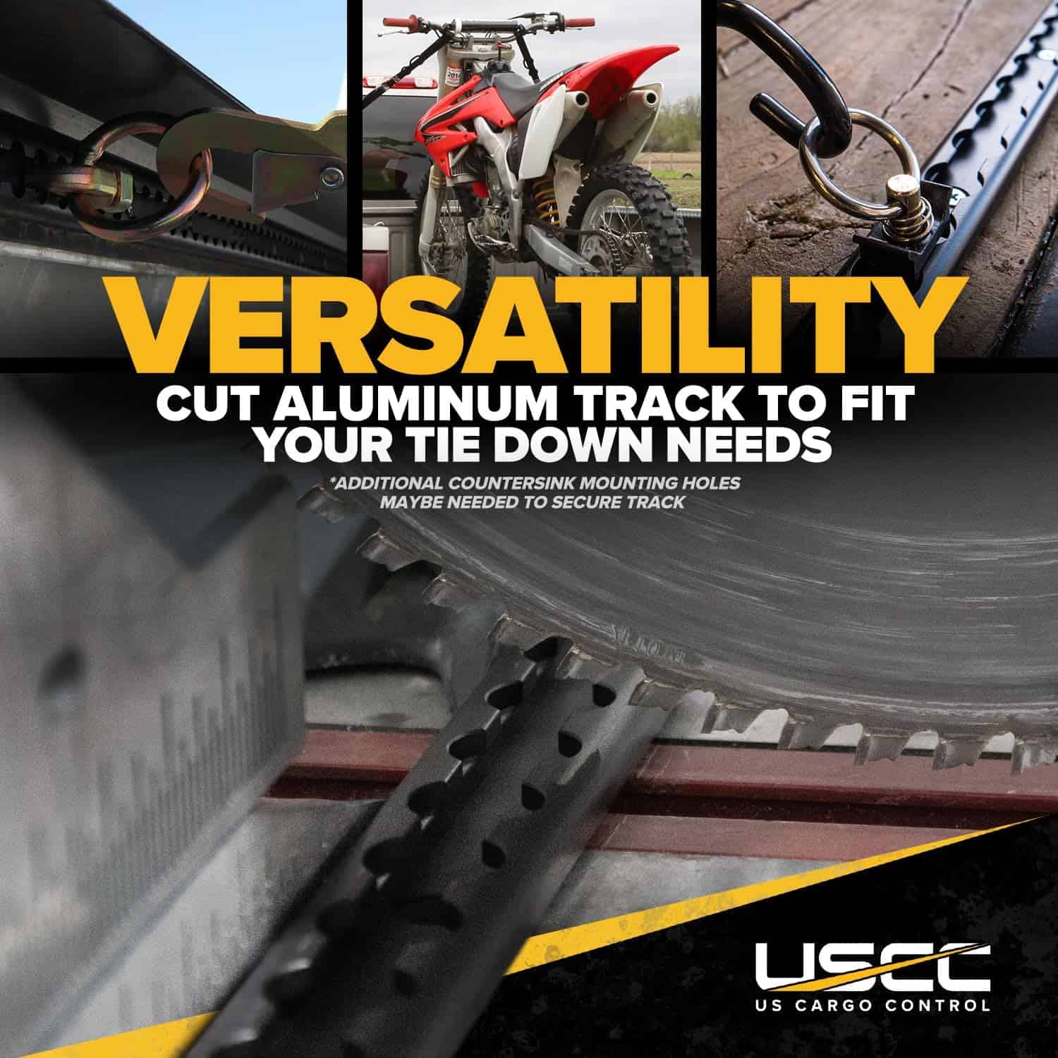 El Sistema de Amarre de Riel en L de Aluminio con Recubrimiento de Polvo Negro de US Cargo Control es un kit de powersports de 6 piezas que incluye 2 – 4 pies de riel en L de aluminio con recubrimiento en polvo negro (Agujeros preperforados para una fácil instalación) y 4 – fijaciones de perno de anillo individuales con anillos redondos de acero inoxidable. Este kit no incluye el hardware de montaje. El Riel en L de este sistema de amarre en riel en L se fabrica en un aluminio ligero y de alta resistencia (6061-T6) con un acabado de recubrimiento en polvo negro para proteger el aluminio y resistir arañazos y colisiones. Este sistema de amarre de cama de camión también se puede utilizar como puntos de anclaje de amarre para remolques. ¡Use estos puntos de anclaje al transportar una variedad de artículos que incluyen: ATV, UTV, motocicletas, bicicletas de tierra, motos de nieve, cortadoras de césped, y prácticamente cualquier artículo que necesite transportar! No hay clasificación en el Riel en L, ya que la clasificación se ve afectada por el material al que están acoplados. La fijación de perno individual con anillo redondo está clasificada según el ángulo de la tracción: Tracción Recta 1,333 lb. Límite de Carga de Trabajo | Tracción de 45 Grados 1,000 lb Límite de Carga de Trabajo | Tracción de 90 Grados 667 lb. Límite de Carga de Trabajo. Este kit se puede utilizar como un sistema de rieles de cama de camión, un sistema de amarre para remolque, o un sistema de rieles de amarre en cualquier lugar donde necesite puntos de anclaje!