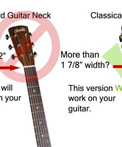 Esta versión es solo para guitarras clásicas (de cuello ancho) que tienen un ancho de cuello MAYOR a 1 7/8″. Por favor mide el cuello de tu guitarra antes de ordenar. No ordenes este artículo si no tienes una guitarra clásica. Esta unidad no funciona en anchos de cuello estándar de 1 7/8″ y más delgados, guitarras de 12 cuerdas o de tamaño fraccionado. Las guitarras clásicas normalmente tienen una mezcla de cuerdas de nylon y acero. Tan pronto como el ChordBuddy esté correctamente adjunto a tu guitarra clásica acústica, podrás hacer música. Dentro de unas semanas, comenzarás a retirar algunas de las pestañas y a hacer los acordes por tu cuenta. ¡En dos meses, podrás tocar la guitarra sin ChordBuddy! Cada paquete incluye el ChordBuddy e instrucciones sobre cómo adjuntar correctamente el dispositivo a tu guitarra eléctrica o acústica. El plan de lecciones y la aplicación descargable compañera te harán tocar canciones populares en poco tiempo. La aplicación se puede descargar desde Google Play o la App Store. El libro de canciones ChordBuddy incluye algunas canciones populares y te muestra cómo tocarlas con y sin ChordBuddy. Esta versión del ChordBuddy SOLO funciona en guitarras clásicas de estilo de cuello ancho. No funcionará en una guitarra zurda. Tampoco funciona en guitarras de 12 cuerdas o de tamaño medio (para niños). El libro de canciones de ChordBuddy codificado por colores incluye muchos éxitos pasados y presentes incluyendo éxitos de los géneros de country, bluegrass, gospel y rock and roll. Mide a lo ancho el cuello de tu guitarra en la tuerca (la barra blanca entre donde colocas los dedos y las clavijas de afinación). Si el ancho es mayor a 1 7/8″, tienes una guitarra clásica. Si rasgueas con la mano derecha y la cuerda más grande está en la parte superior, es una guitarra diestra. Si rasgueas con la mano izquierda y la cuerda más grande está en la parte superior, es una guitarra zurda. El DVD ha sido reemplazado por la aplicación.