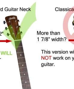 1. Comienza a tocar la guitarra desde el momento en que instalas el ChordBuddy. Incluye el Afinador Cromático True Tune TT-05 que te pone afinado y listo para tocar. Este es un ChordBuddy genuino hecho en USA. 2. POR FAVOR MIDE el cuello de tu guitarra antes de ordenar. Tu cuello debe tener un ancho mínimo de 1 1/2 y un máximo de 1 7/8) y desde la cejuela hasta el 3er traste debería ser aproximadamente 4 . Si tu cuello tiene más de 1 7/8″ necesitas la versión de «guitarra clásica». Si es menos de 1 1/2″ el ChordBuddy no funcionará en tu guitarra. La distancia de la cejuela al 3er traste debe ser aproximadamente 4 , si es menos la unidad puede no funcionar correctamente. 3. Solo para DIESTROS. Esta versión solo funciona en guitarras diestras. Una versión para zurdos está disponible en nuestras otras publicaciones. 4. El ChordBuddy funciona en la mayoría de las guitarras acústicas y eléctricas estándar de tamaño completo, dreadnought, 3/4 y 5/8 con una altura de cuerda promedio a baja. Esta versión no funcionará en guitarras de 1/2 tamaño. Cada guitarra es diferente y la instalación puede variar. Algunas guitarras pueden tomar tiempo adicional para ajustar el ChordBuddy y hacerlo funcionar correctamente. 5. Producto probado en Shark Tank y es un sistema de aprendizaje integral y efectivo, adecuado para todas las edades cuando se usa correctamente. Por favor visite ChordBuddy en la web para obtener consejos de instalación, trucos e información adicional. El afinador está empaquetado dentro de la caja de ChordBuddy. El DVD está siendo eliminado y pronto solo incluirá contenido descargable a través de la aplicación/internet.