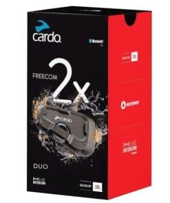 Live sound. Live Connection. Experimente una calidad de audio excepcional con nuestro nuevo intercomunicador Bluetooth con reconexión automática. Para 2 pilotos a una distancia de 800m/0.5mi. Sounds by JBL: Potentes altavoces de alta definición de 40 mm, perfeccionados por expertos de JBL, con un procesador de música especialmente ajustado y 3 perfiles de audio distintivos, harán que su experiencia de conducción sea excepcional. Impermeable: No importa lo que le arrojes, tu FREECOM 2X resistente al agua se llevará el golpe y te mantendrá conectado. Lluvia, sol, barro, polvo o nieve. Actualizaciones de software via aire: Mantenga siempre actualizada su unidad a través de la aplicación Cardo Connect. Descargue actualizaciones de software por aire cada vez que haya una nueva versión disponible. Radio FM incorporada con RDS para selección automática de la señal más fuerte, ya sea en la ciudad o en medio de la nada. Conectividad universal: Se conecta con cualquier otro auricular Bluetooth de cualquier marca. Volumen automático: Ajusta automáticamente el volumen del sonido en función del ruido ambiental exterior. Streaming de música: Toda la música que desee se transmite directamente desde su teléfono inteligente. Controle, comparta y disfrute de su canción favorita en la carretera. Teléfono y GPS: Realice llamadas y controle su GPS con un toque de dedo o con el sonido de su voz. Carga rápida: ¿Se está quedando sin batería? Obtenga 2 horas de tiempo de conversación después de 20 minutos de carga. USB tipo C robusto y universal para conexiones fáciles con cualquier dispositivo. Rueda de control: Comodidad y control extra, todo en una pequeña rueda.