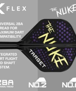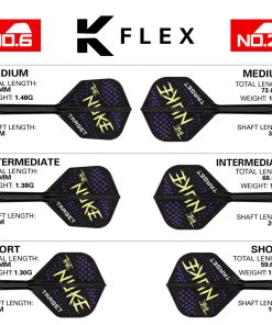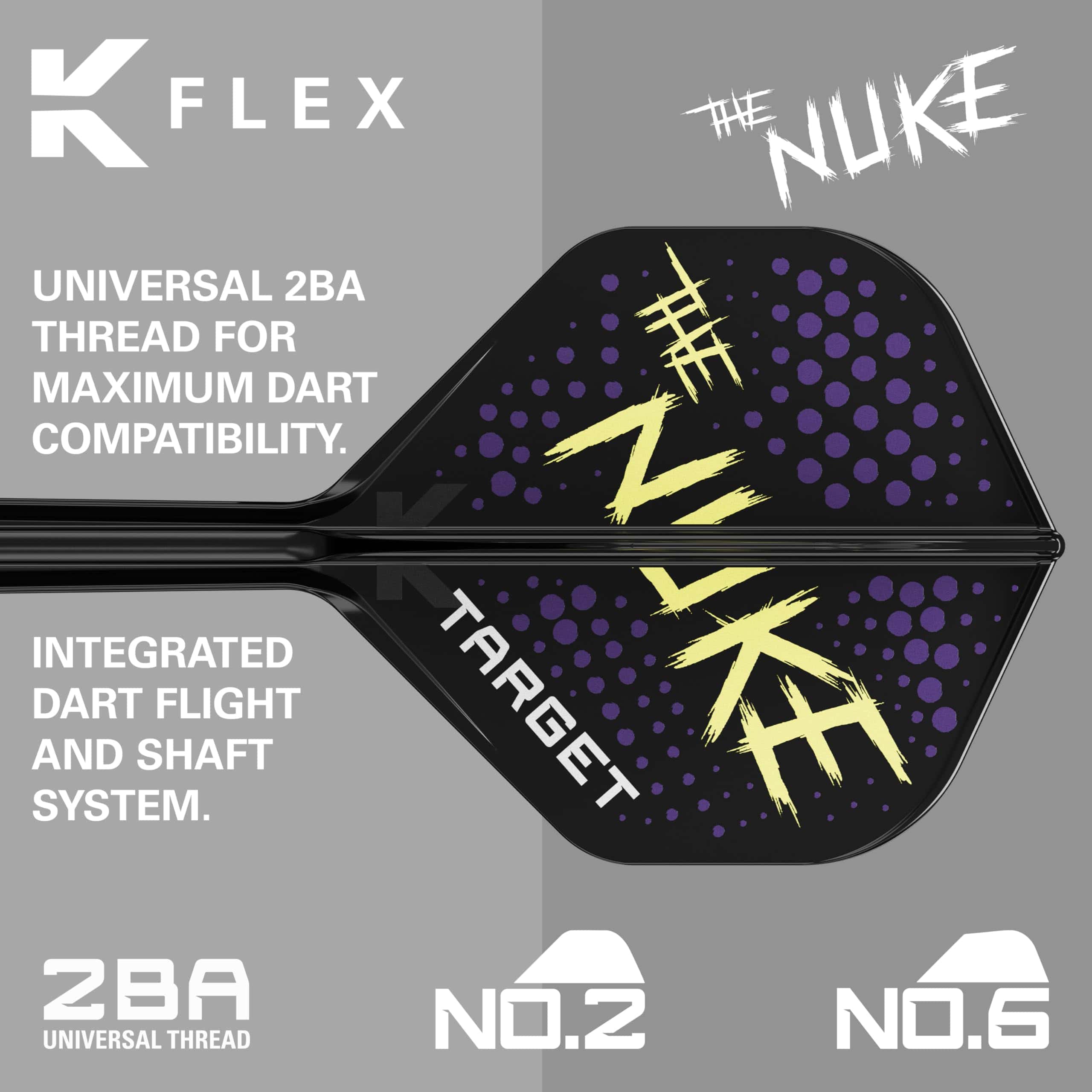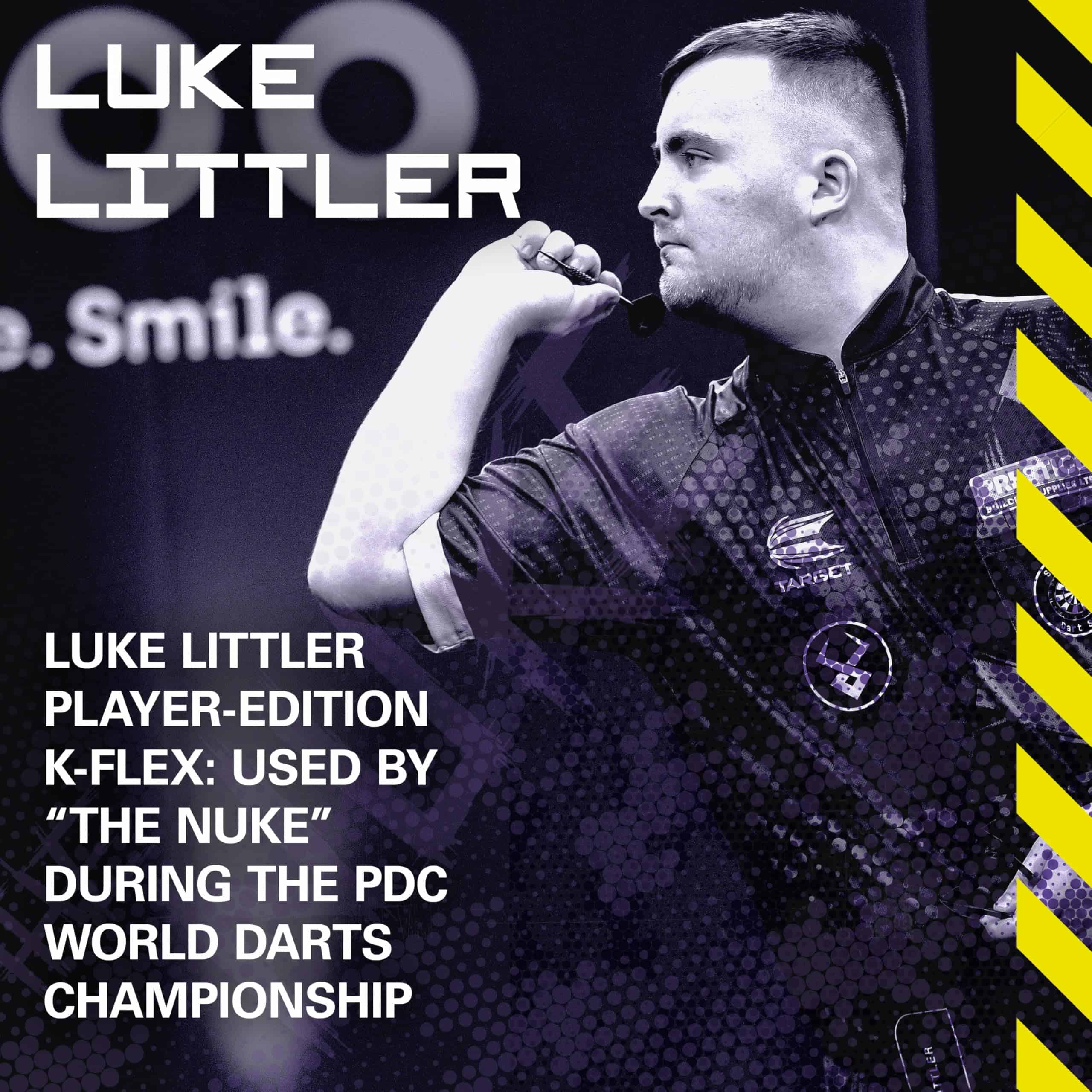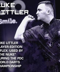 1. SISTEMA DE VUELOS K FLEX DE LUKE LITTLER: Presentamos el sistema de vuelo y eje integrado KFlex de edición de jugador Luke Littler. Creado en colaboración con Nuke, con su logotipo característico en amarillo fluorescente y morado llamativo.