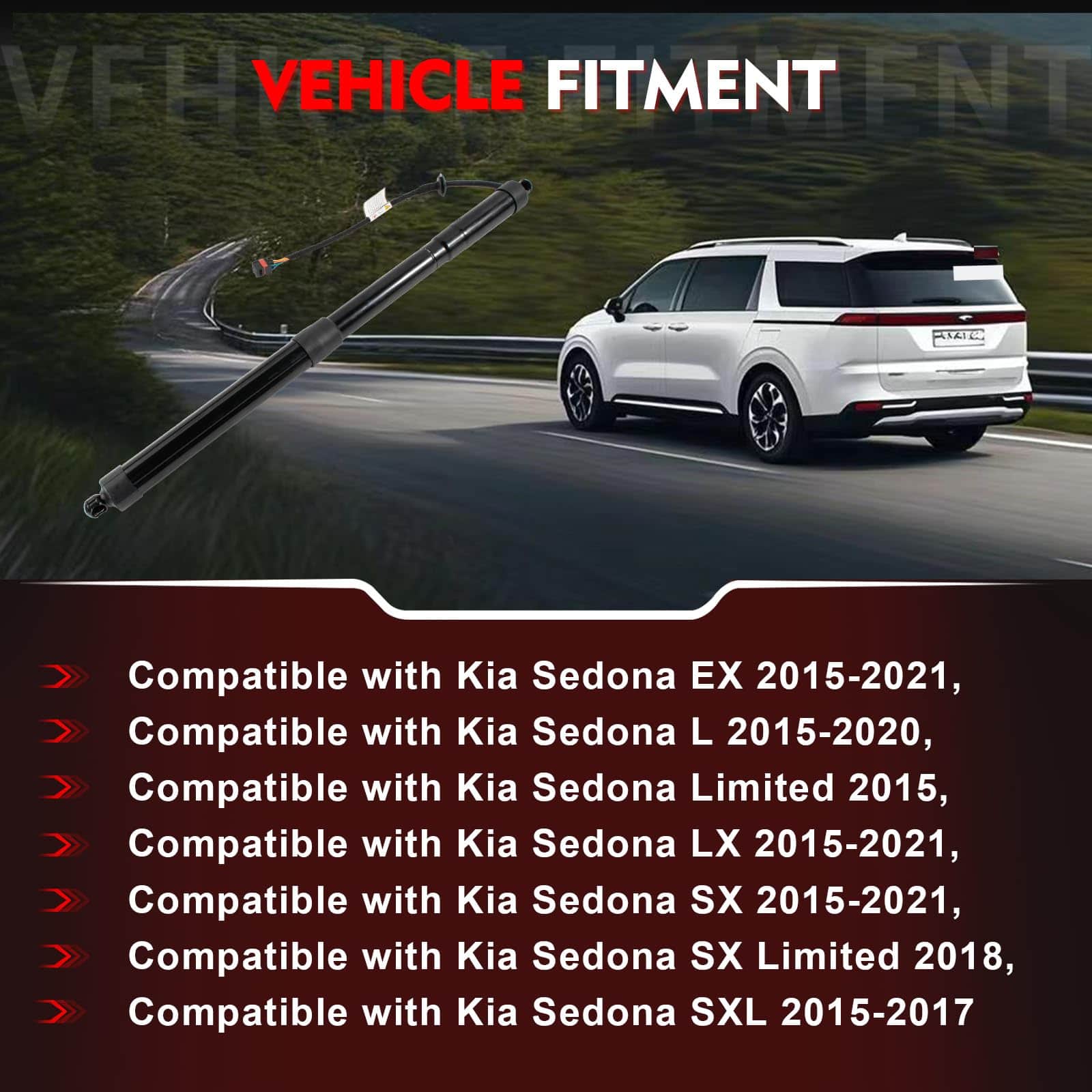2. Compatibilidad del vehículo Compatible con Kia Sedona EX 2015-2021, Sedona L 2015-2020, Sedona Limited 2015, Sedona LX 2015-2021, Sedona SX 2015-2021, Sedona SX Limited 2018, Sedona SXL 2015-2017 Sistema de Elevación de la Puerta Trasera Izquierda del Maletero.