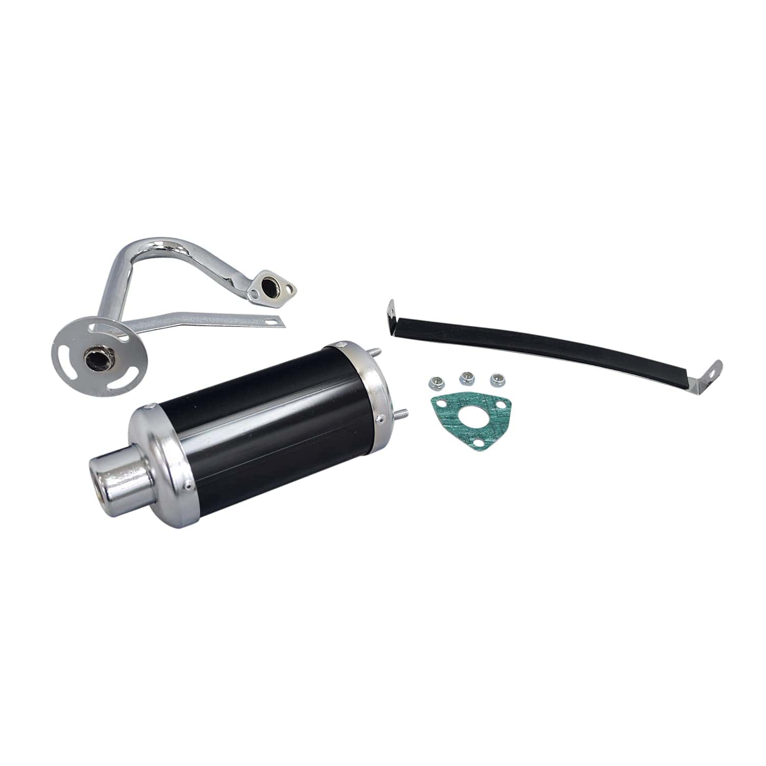 Nuestro sistema de escape de alto rendimiento para go-karts con motor de 6.5 Hp incluye el silenciador, la tubería, el empaque y el hardware de montaje.