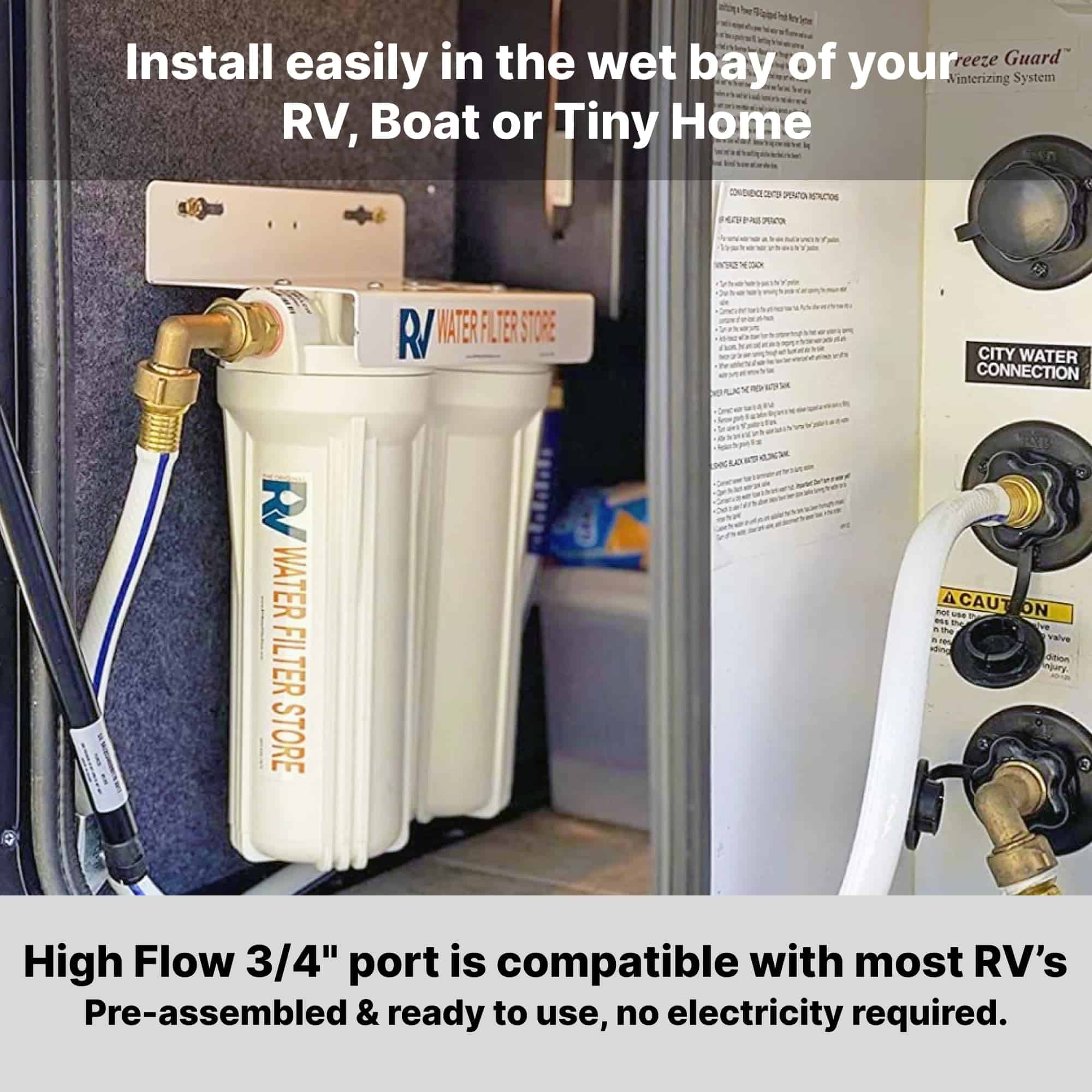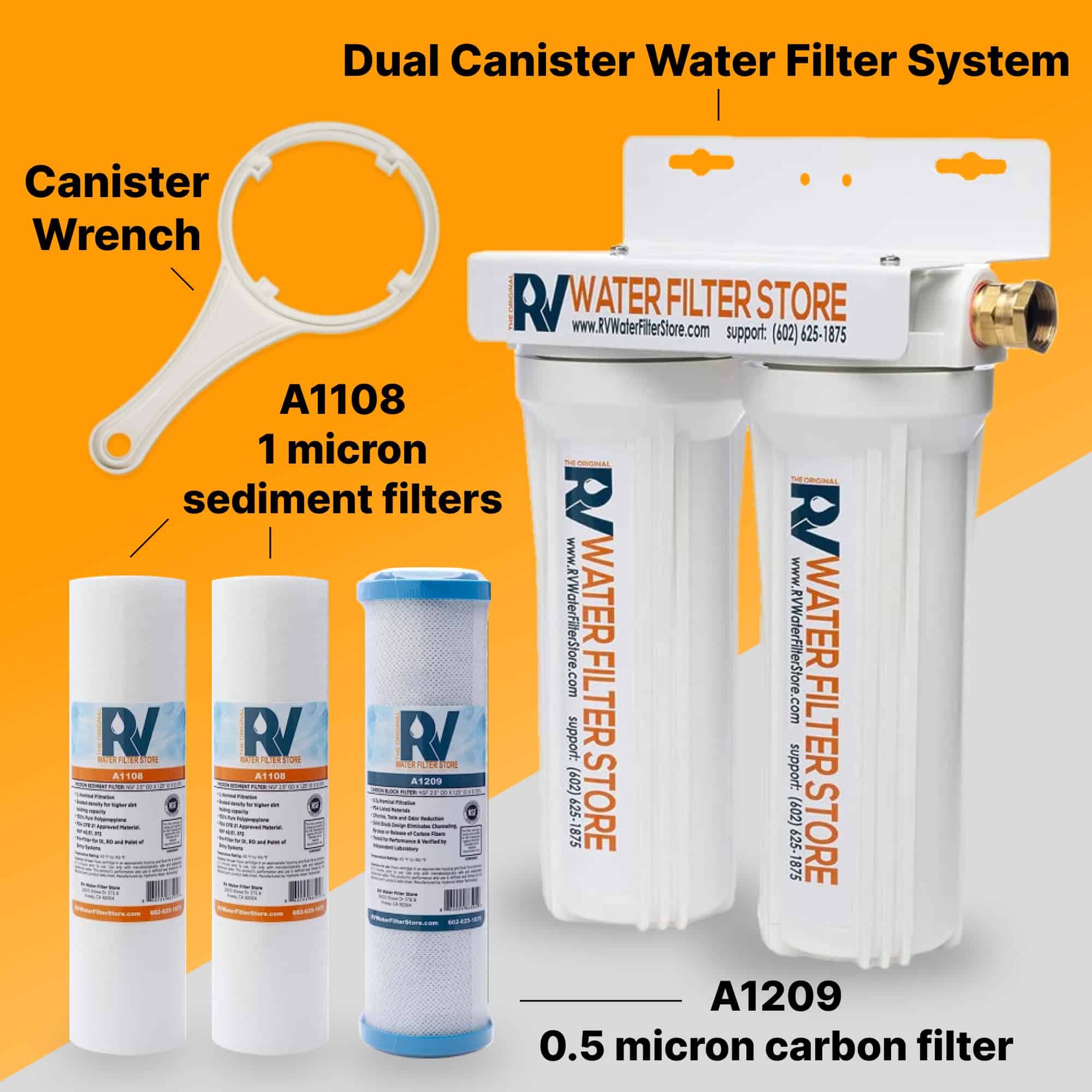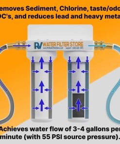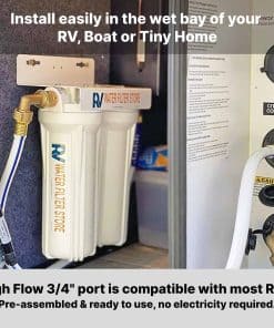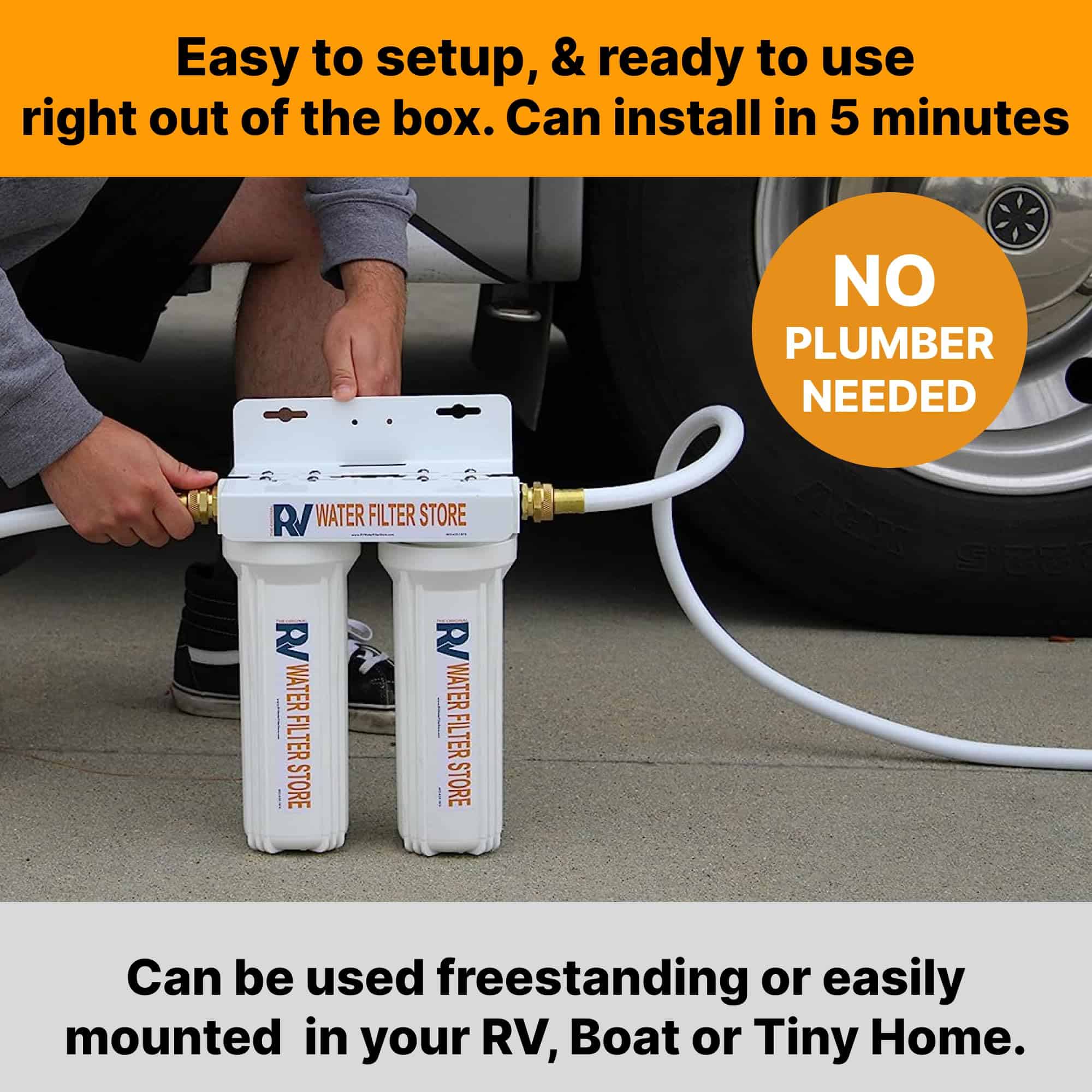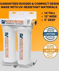 El Sistema Essential ha sido el más vendido en la Tienda de Filtros de Agua para RV durante muchos años. Este sistema viene completamente ensamblado y listo para usar con conexiones de manguera para una fácil conexión a la fuente de agua externa de tu RV, Conversión de Van, Barco, Casa flotante, Casa pequeña y aventureros que viven Off-the-Grid. Ahora hemos incluido el soporte para estabilización al colocarlo en el suelo, colgarlo o almacenarlo en un recipiente. El sistema de dos recipientes alberga un filtro de sedimento de 1 micrón para eliminar partículas en suspensión de hasta 1 micrón, luego un filtro de bloque de carbón modificado de clase 1, que elimina quistes (giardia y cryptosporidium), Cloro, COV, problemas de sabor/olor y pesticidas. Este filtro también tiene material adsorbente de plomo mezclado con el carbón y las fibras para hacer la mejor combinación de flujo de agua y filtración en un recipiente estándar de 10″ en el mercado. El sistema está destinado a purificar el agua antes de que entre en tu RV.