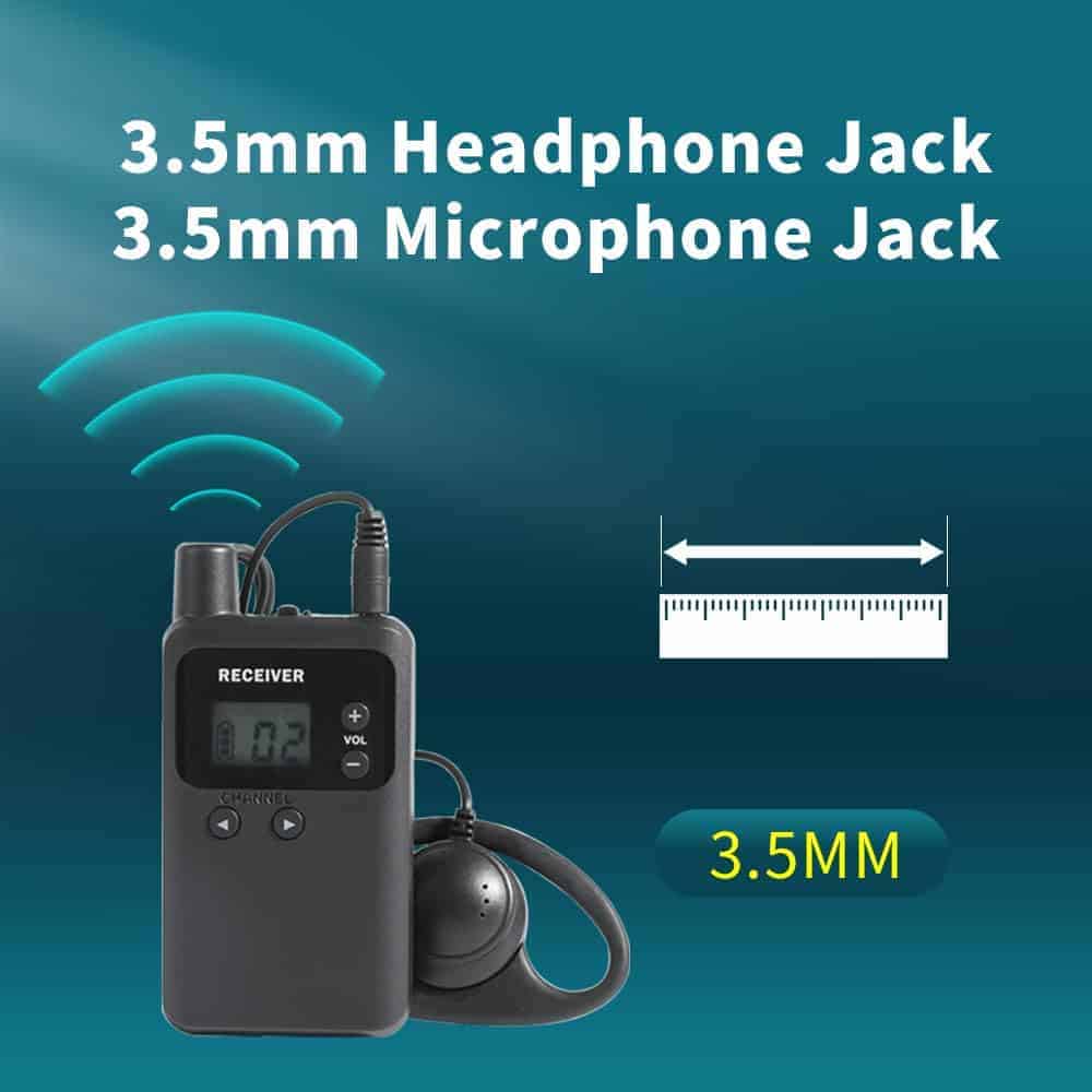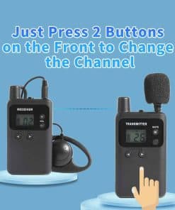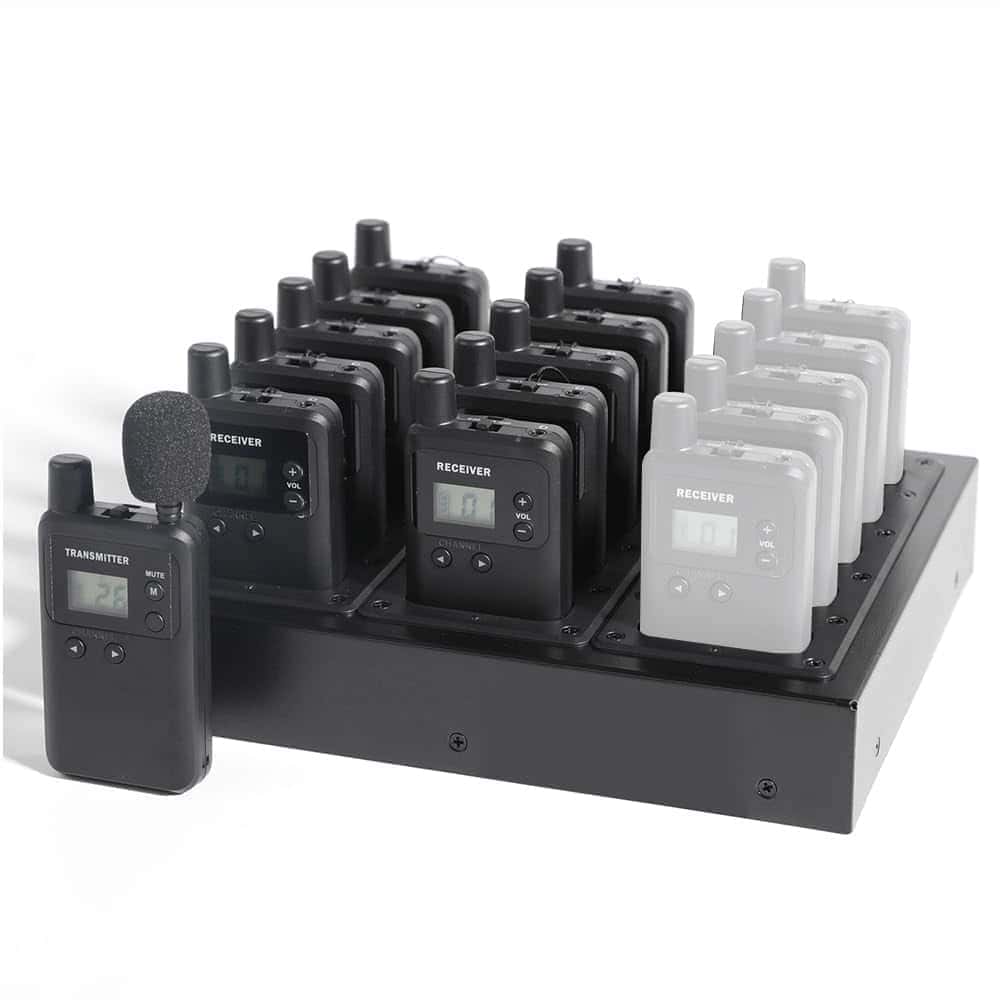 1. PRECIOSO Y RESISTENTE – Los dispositivos tienen un diseño atractivo y resistente, con una construcción compacta y sólida. Cada dispositivo pesa 50 gramos. El material de la carcasa está hecho de plástico ABS, que no se romperá fácilmente. Cada dispositivo se empaqueta con una bolsa de polietileno. Este es un sistema de comunicación unidireccional. Solo puede haber un transmisor en el mismo grupo/canal. 2. AMPLIA APLICACIÓN – El sistema de comunicación de audio unidireccional inalámbrico está diseñado específicamente para grupos turísticos, tours de fábrica, capacitación, conferencias, eventos, interpretación simultánea y ferias comerciales. Cada miembro del grupo puede escuchar al orador clara y silenciosamente. El orador puede susurrar a cada oyente. Se proporcionan 2 micrófonos, uno de diadema y otro más pequeño que se enchufa directamente, para diferentes propósitos. Esto también es muy útil para personas con audífonos. 3. AMPLIO RANGO DE TRABAJO – El rango de trabajo entre el transmisor y los receptores es de 150-180 metros en línea de visión. Ya sea un grupo turístico pequeño o una conferencia grande, estos dispositivos funcionarán de manera satisfactoria. Los dispositivos contienen 26 canales, lo que asegura que diferentes grupos no interfieran entre sí en la misma área. La frecuencia de trabajo es UHF 902-928 MHz, más adecuada para su uso en América del Norte. 4. LARGO TIEMPO DE TRABAJO – Cada dispositivo tiene una batería de iones de litio recargable de alta capacidad de 1000 mAh. El transmisor puede funcionar durante 8 horas continuas después de una carga completa. El receptor puede funcionar durante 15 horas continuas después de una carga completa. Esto evitará muchos problemas de recarga. Se incluye también un cargador de 15 ranuras en el paquete. Se tardarán 3 horas en cargar completamente. Cuando los dispositivos se están cargando, la luz se pondrá roja. Cuando están completamente cargados, la luz se pondrá azul. 5. OPERACIÓN SENCILLA – Cuando el transmisor y los receptores están en el mismo canal, los receptores pueden escuchar al transmisor. Si necesita cambiar a otro canal, simplemente presione el botón IZQUIERDA o DERECHA para cambiar el canal. Mueva el botón de encendido para BLOQUEAR el dispositivo. Cuando el dispositivo está bloqueado, no se puede cambiar el canal. El volumen del receptor se puede cambiar en cualquier momento con los botones + o -. Estas son básicamente todas las operaciones principales.