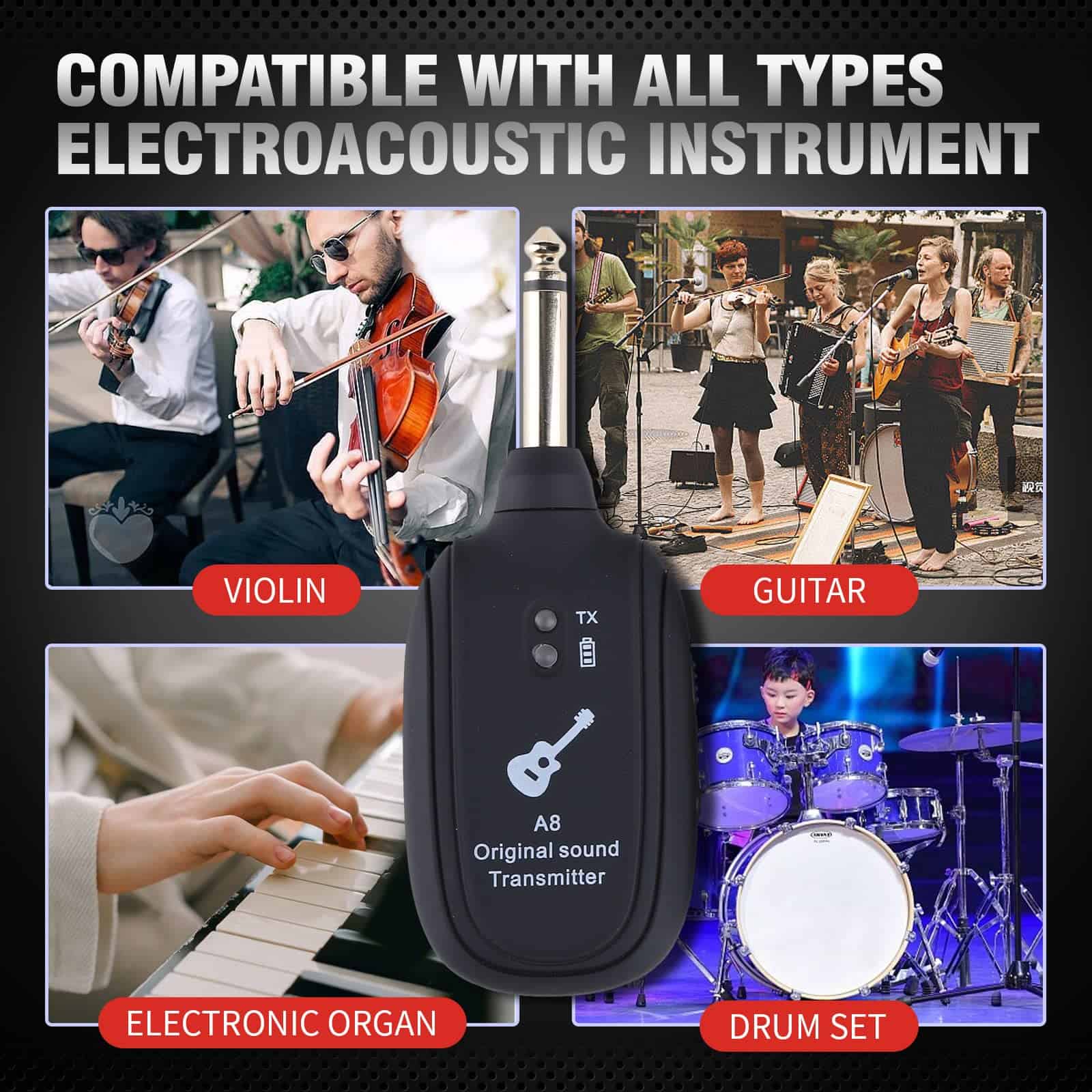 5. Ampliamente Utilizado: El sistema de micrófono inalámbrico tiene una transmisión de señal clara y es adecuado para la mayoría de guitarras eléctricas, bajos, violines, teclados, guitarras eléctricas e incluso los instrumentos electrónicos más populares con un jack de 6.35mm.