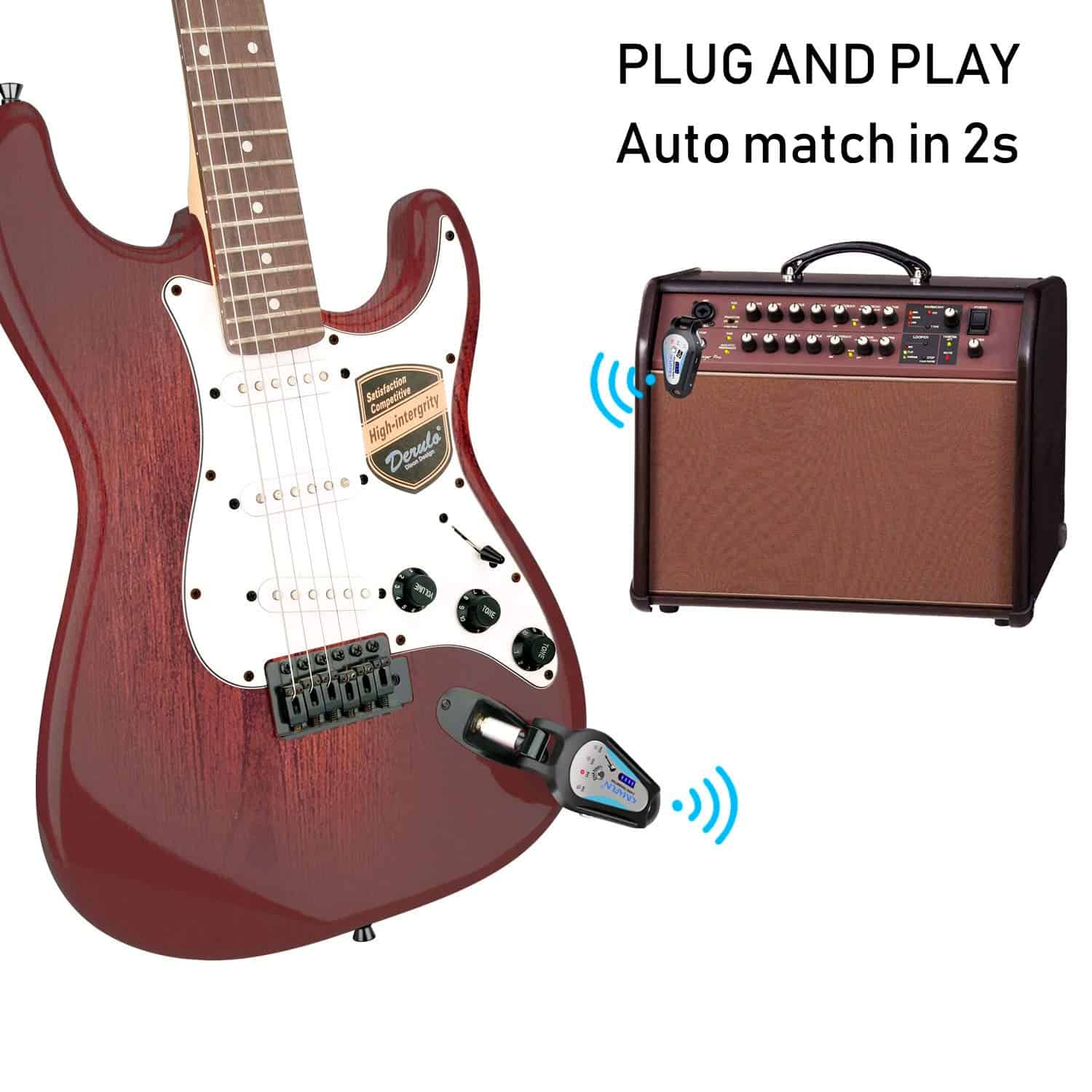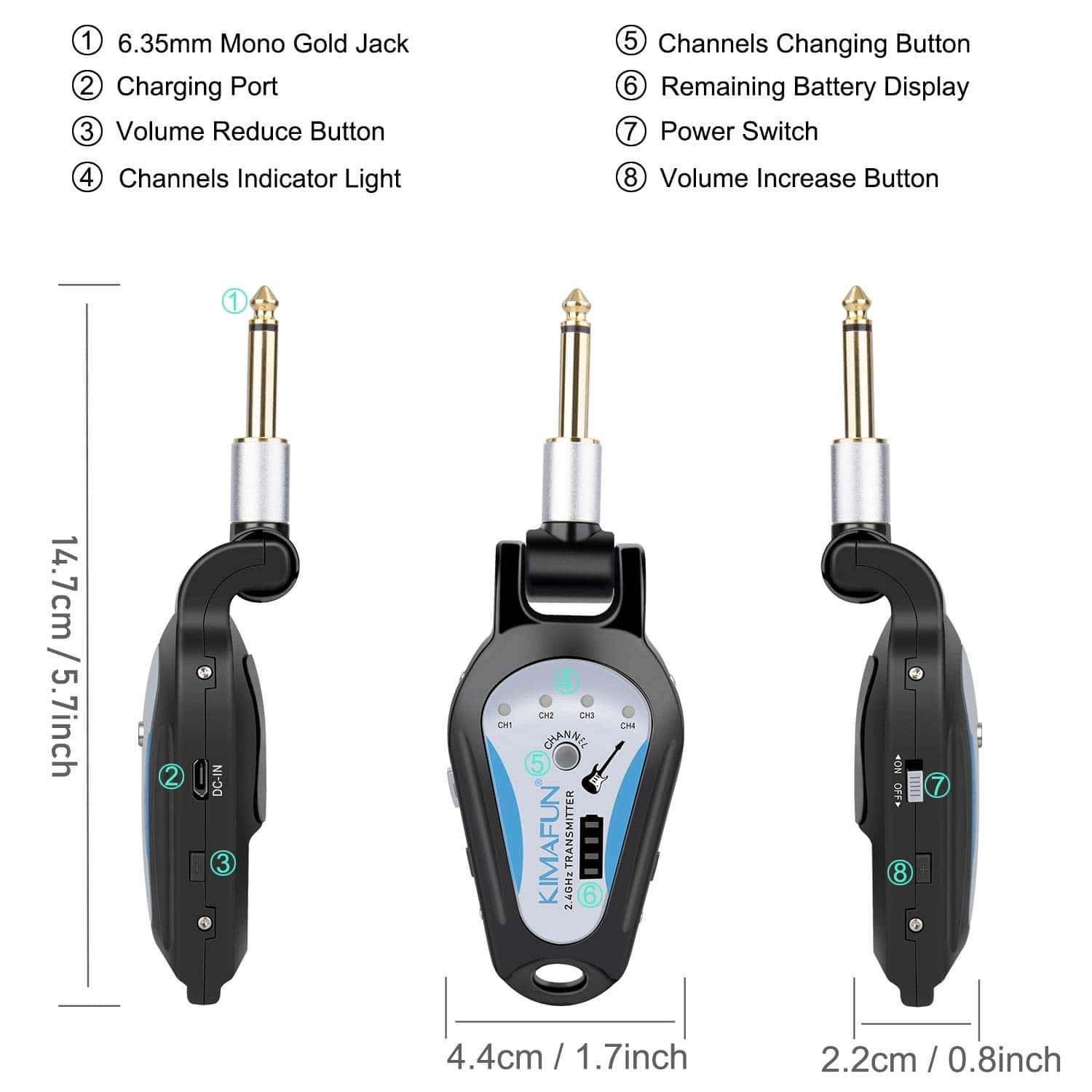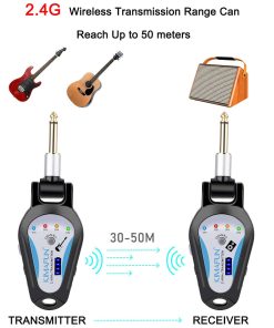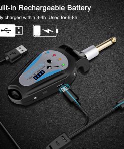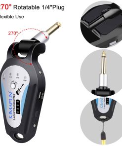 Sistema inalámbrico de guitarra KIMAFUN de 2.4GHz, diseñado para ofrecer una transmisión de señal sin compresión, bajo ruido y baja latencia. Con un rango efectivo de aproximadamente 50 metros, este sistema se empareja automáticamente al encenderlo, con una luz indicadora que muestra cuando está listo para usarse. La conexión cuenta con un enchufe de 1/5″ giratorio 270 grados que se adapta a diferentes posiciones de entrada en instrumentos. Con 5 canales diferentes, este sistema soporta modos uno a uno, uno a más y la conexión de hasta 4 sets de dispositivos al mismo tiempo. La batería de litio recargable se carga en 3-4 horas y proporciona una duración de 6-9 horas de uso continuo. Incluye un cable USB dual para una carga conveniente y cuenta con cuatro niveles de indicación de batería. Este conjunto de transmisor y receptor inalámbrico está especialmente diseñado para instrumentos de música electrónica como guitarras y bajos, ofreciendo una solución práctica y eficiente para músicos en movimiento.