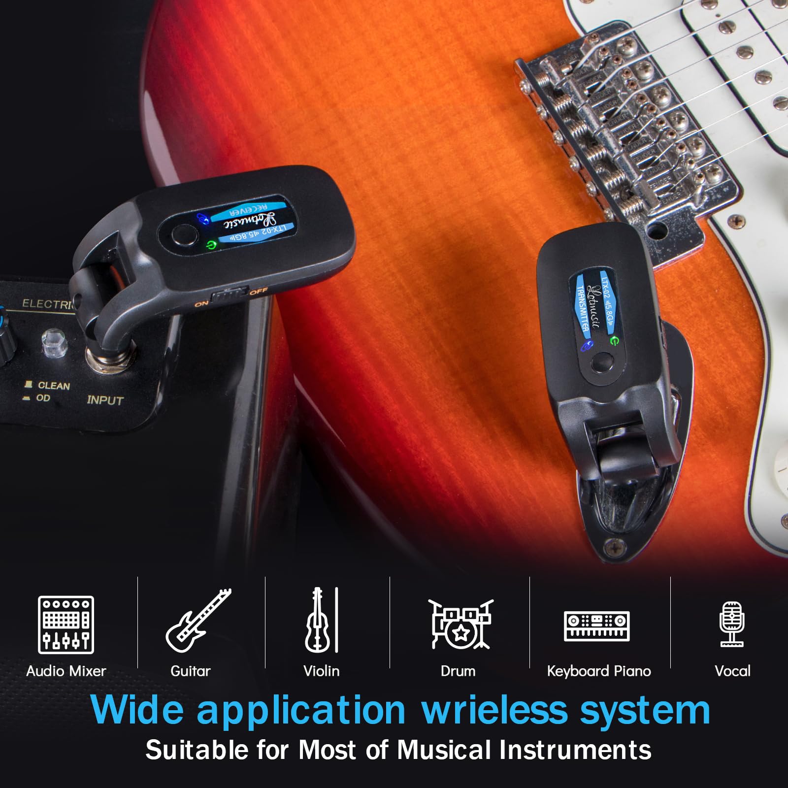 1. Plug and Play: Admite 6 sets de dispositivos trabajando simultáneamente, transmisor-receptor inalámbrico uno a uno y sin interferencias; un transmisor puede transmitir una señal a varios receptores al mismo tiempo también. 2. Rendimiento Impresionante: Muestreo cristalino en un rango de frecuencia que abarca de 10Hz a 22kHz, puedes capturar y transmitir los matices más sutiles con nuestro sistema de guitarra inalámbrica Transmisor Receptor. 3. Transmisión de Señal Estable y Clara de 30m: Nuestros transmisores-receptores inalámbricos utilizan un Chip de 5.8 GHZ, transmisión de señal sin comprimir, baja interferencia y latencia, el rango efectivo es de aproximadamente 30 metros. 4. Adecuado para Varias Ocasiones: Diseño de enchufe giratorio de 270 grados. Apto para todos los instrumentos de música electrónica con conector de 6.35 mm. 5. Larga Duración de Batería y Recargable: Batería de litio recargable de 3.7V/650 mAh incorporada, más de 10 horas de trabajo por 1.5 horas de carga, el paquete de transmisor-receptor inalámbrico viene con un cable USB para una recarga conveniente.