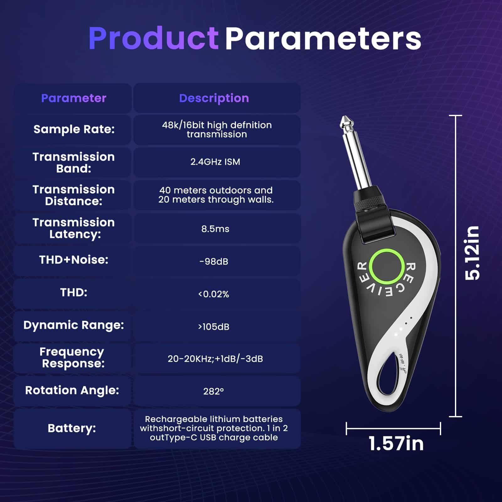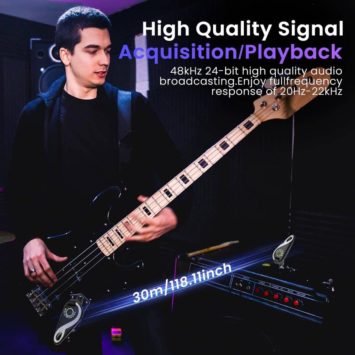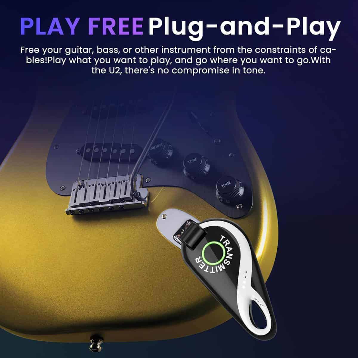Sistema inalámbrico de guitarra completo y profesional que incorpora un transmisor y receptor inalámbricos de alta calidad, diseñado para satisfacer las necesidades de los músicos en vivo. Este sistema ofrece una larga duración de la batería, lo que garantiza hasta 15 horas de uso continuo en una sola carga. Además, la calidad de sonido de alta definición y la transmisión de audio HD de 48K/16bit aseguran que cada nota y acorde se transmitan de manera clara y auténtica. La flexibilidad del sistema, con su cabeza giratoria de 280 grados, permite una fácil adaptación a una amplia gama de guitarras y otros instrumentos. La transmisión de largo alcance de hasta 30 metros y la capacidad de transmitir a través de paredes hasta 20 metros de distancia brindan una libertad total de movimiento en el escenario. ¡Haz que tu actuación suene impecable con este innovador sistema de guitarra inalámbrico!