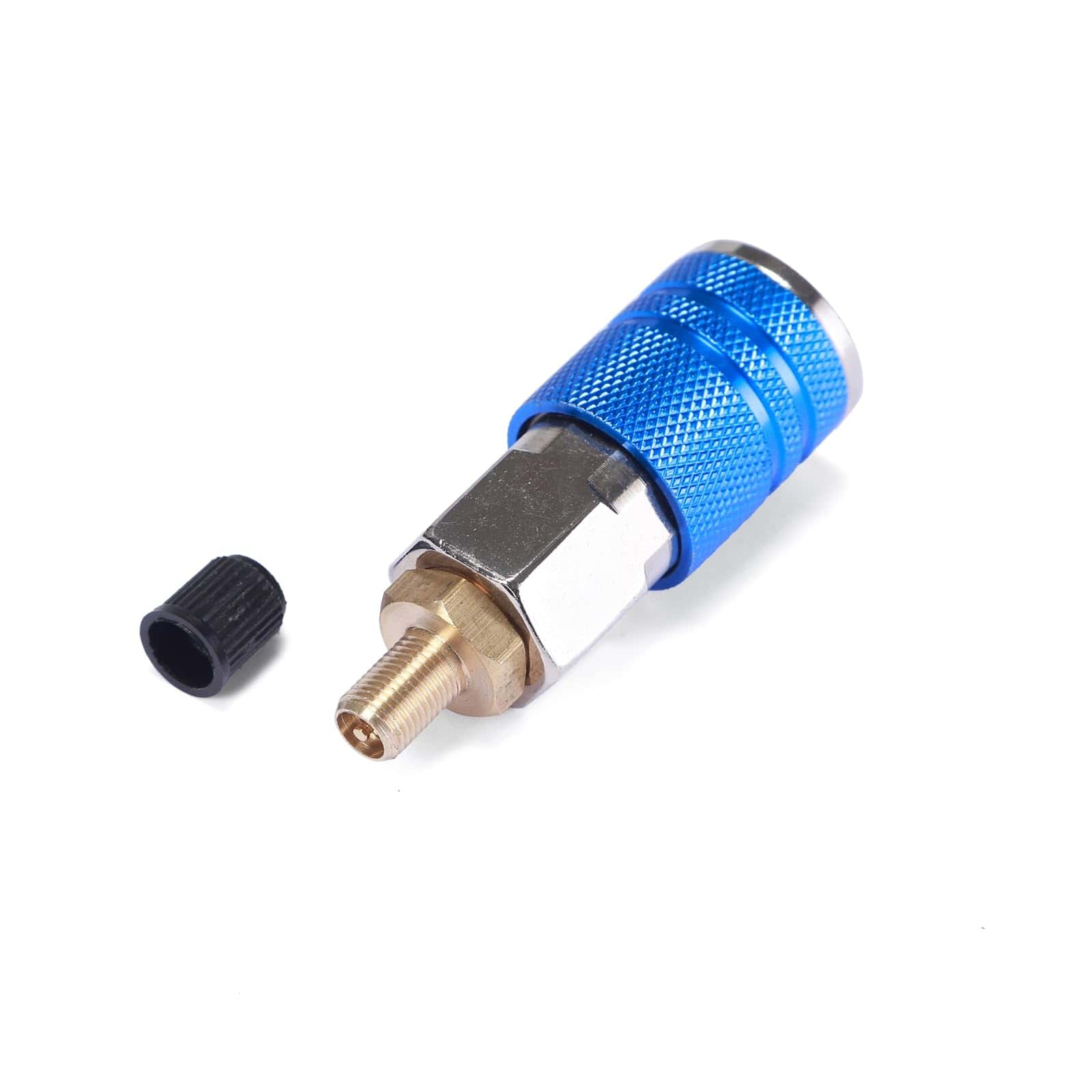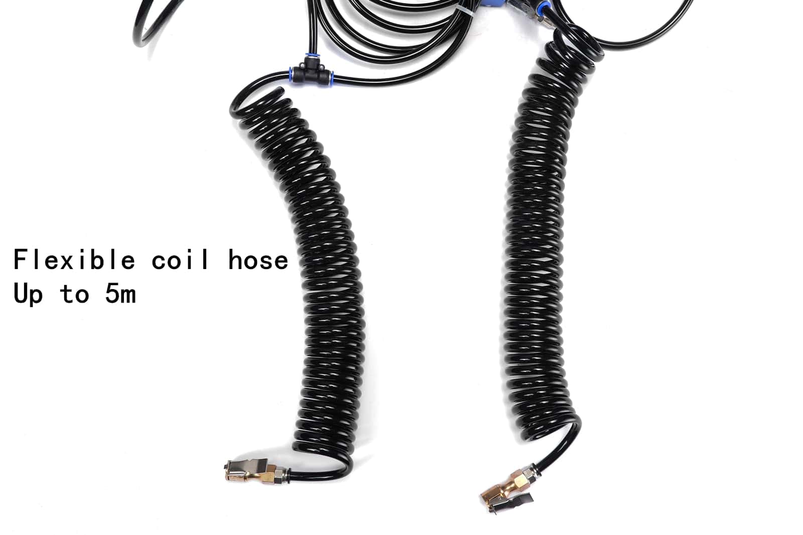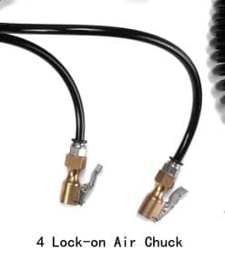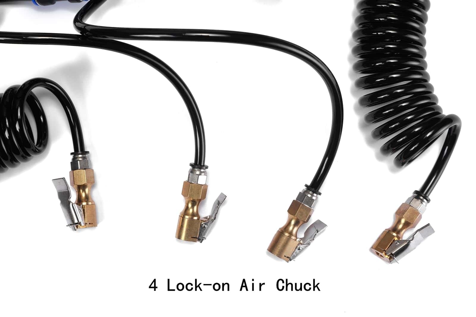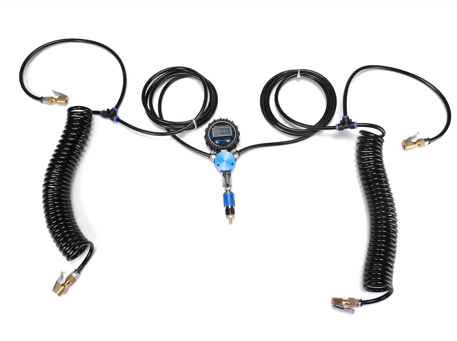 Sistema de inflado/desinflado de 4 neumáticos, manómetro digital de presión de neumáticos con boquilla de aire bloqueable. Conecte a 4 neumáticos, inflado desinflado al mismo tiempo para coches, camiones, todo terreno, compatible con todos los compresores y tanques de aire. Velocidad de carga rápida: Conecte los 4 neumáticos uno por uno, puede cargar los 4 neumáticos al mismo tiempo en segundos, la manguera interna mide 5 mm, el flujo de aire es rápido, utilizamos una manguera enrollada que está calificada para 150 psi, es fácil de empacar y usar el sistema de inflado de 4 neumáticos. Manómetro digital preciso de presión de neumáticos: El manómetro digital de presión de neumáticos es de 0-200 psi, utiliza 2 pilas AAA, las pilas no están incluidas. Boquilla de aire de neumático de flujo cerrado: El Sistema de Inflado y Desinflado de 4 Neumáticos está equipado con boquillas de aire bloqueables para neumáticos, cuando conecta los 4 neumáticos uno por uno, el aire no se filtrará y los 4 neumáticos se igualarán en segundos. Compatible con todas las fuentes de aire: Los compresores de aire de 12v y los sistemas de aire HPA co2 se utilizan ampliamente para cargar neumáticos, nuestro Sistema de Inflado/Desinflado de 4 Neumáticos viene con enchufe y válvula de tallo de válvula de los EE. UU. Igualar automáticamente los 4 neumáticos después de conectar todas las boquillas de aire bloqueables, No es necesario adivinar la presión con el manómetro de presión digital