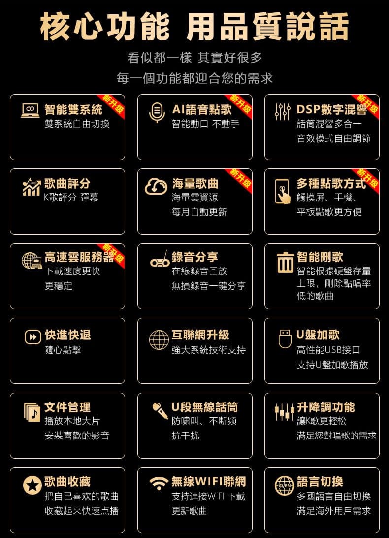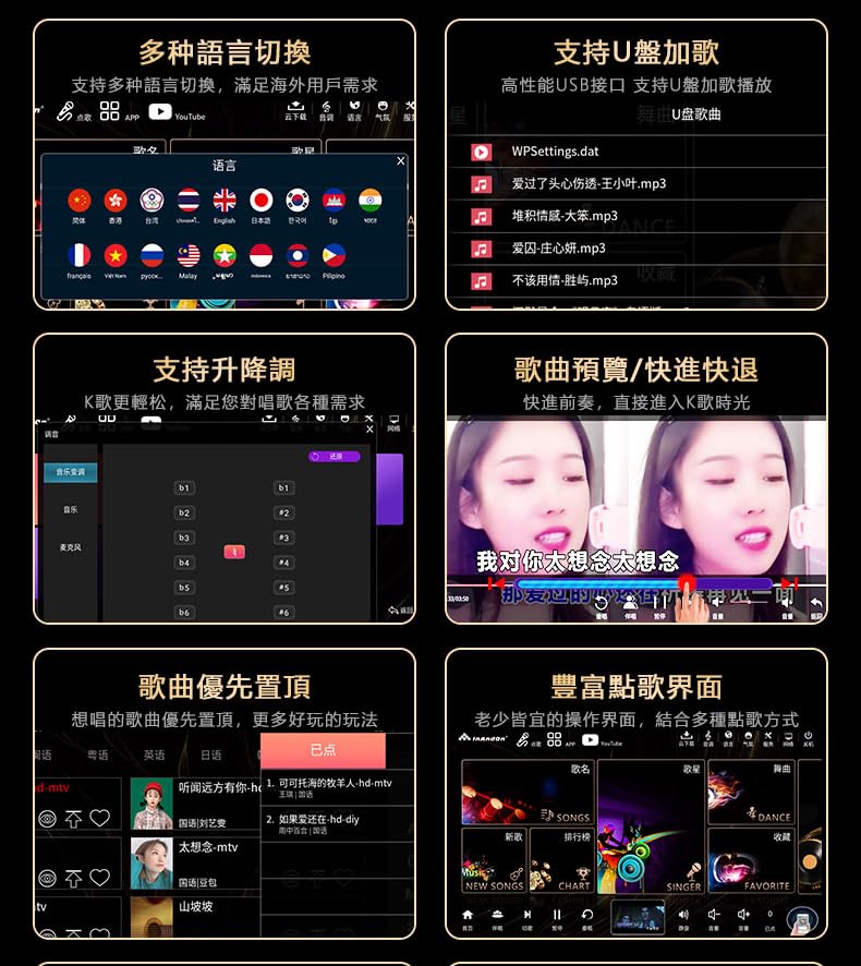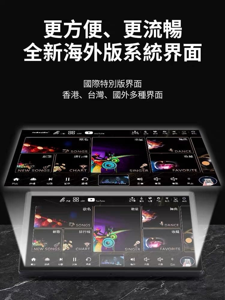 Es el momento de obtener un sistema de KTV para tu hogar ahora. Más de 650K canciones en la nube para descarga gratuita. Admite reconocimiento de voz de IA (solo reconoce el control de voz mandarín). Pantalla capacitiva, más precisa y sensible. Admite YouTube con Android. Función de grabaciones. Función de puntuación de canciones. Añadir canciones en lote con USB. Admite TV HD 4K. Licencia de Copyright de las portadas de canciones. Chino, Cantones, Inglés, Coreano, Japonés y Otros. Aspecto exquisito y compacto. El volumen más pequeño te brinda el contenido más rico. Garantía de un año. Set de Sistema de Karaoke InAndOn Home con pantalla táctil consiste en: 1 X Máquina de Karaoke de 18.5 pulgadas con Canciones en disco duro de 4TB. 2 X Micrófono inalámbrico UHF. Tenga en cuenta que la máquina de karaoke necesita estar conectada a un altavoz con una interfaz RCA (roja y blanca) o AUX. Cómo usar SPELL para ordenar canciones: Ingrese la Primera Letra de cada palabra, por ejemplo:, solo ingrese YYDT. My Heart Will Go On, solo ingrese MHWGO. Es muy fácil. Preste atención a la lista del número de canciones en el sistema de karaoke: Chino: 250K+ Inglés: 20K+ Japonés: 20K+ Coreano: 20K+ Y algunas otras canciones en diferentes idiomas.