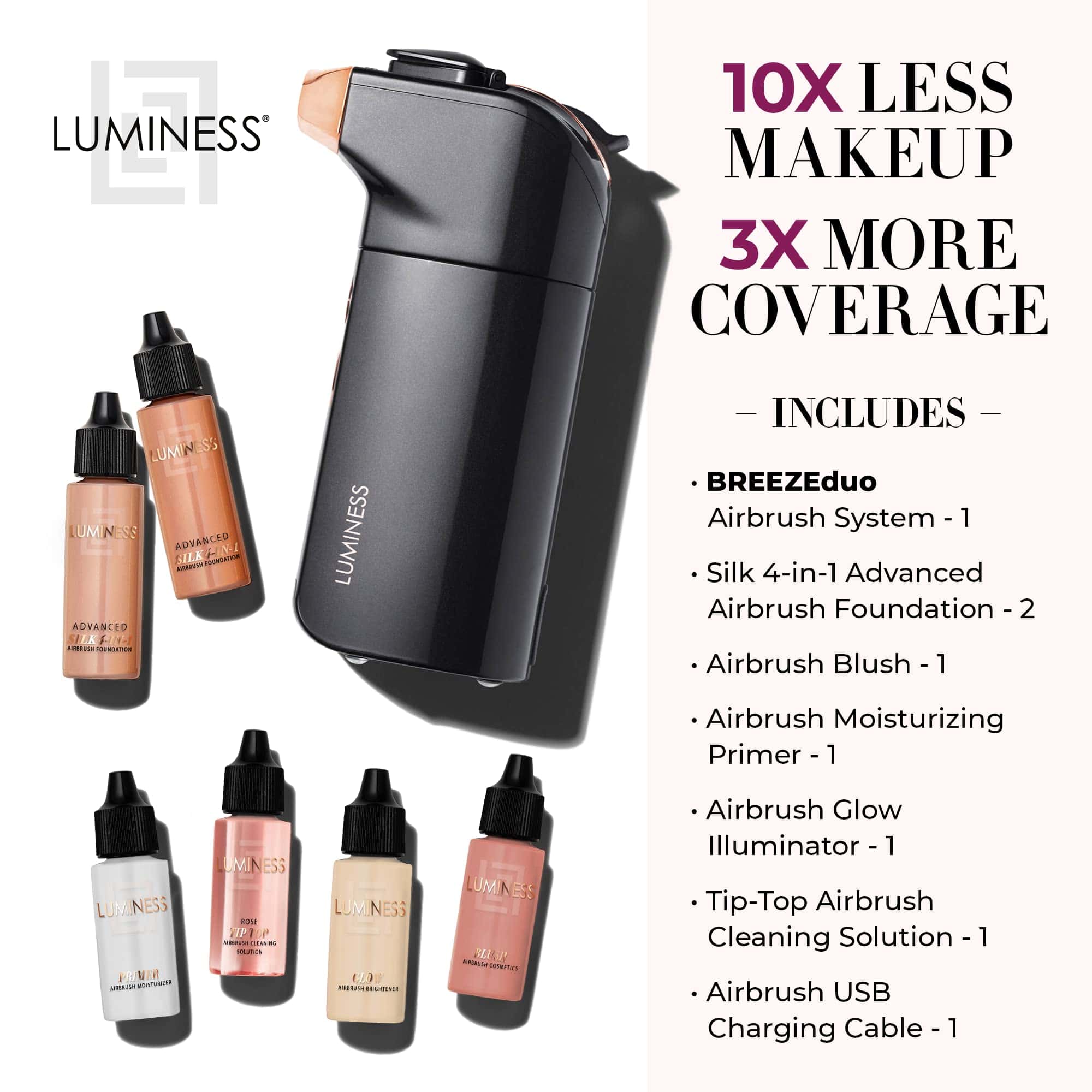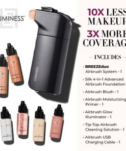 1. 10 veces menos maquillaje, 3 veces más cobertura: El LUMINESS BREEZE Duo es una forma súper conveniente de ocultar rápidamente líneas finas, arrugas e imperfecciones. Aplica maquillaje y cuidado de la piel en una fina niebla para transformar tu piel. Incluye 1 dispositivo BREEZE Duo, cargador, una base avanzada de seda de 0,5 oz en tono 6, una base avanzada de seda de 0,5 oz en tono 7, un rubor Soft Rose de 0,25 oz, un iluminador Glow de 0,25 oz, una prebase hidratante de 0,25 oz y una solución de limpieza para aerógrafo Tip-Top de 0,25 oz.