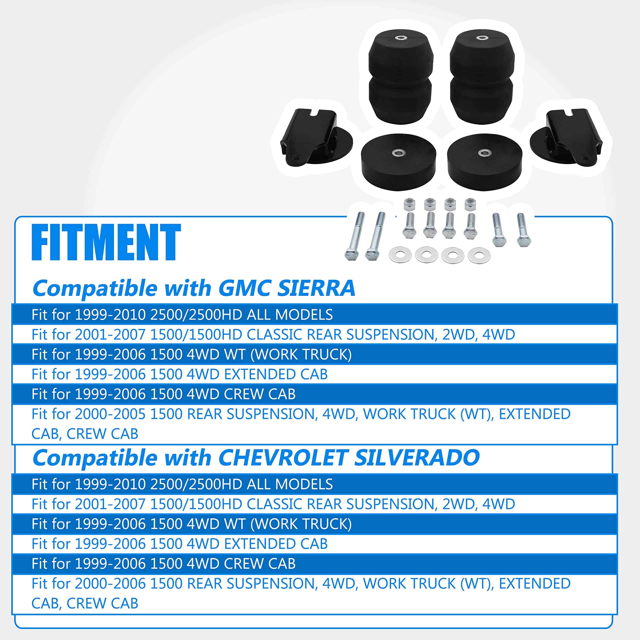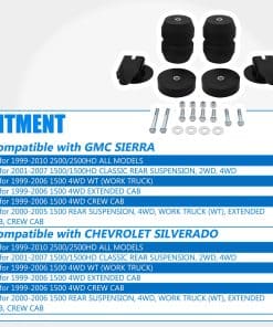 COMPATIBILIDAD Compatible con GMC SIERRA 1999-2010 2500 / 2500HD TODOS LOS MODELOS 2001-2007 1500 / 1500HD CLÁSICO SUSPENSIÓN TRASERA, 2WD, 4WD 1999-2006 1500 4WD WT (CAMIÓN DE TRABAJO) 1999-2006 1500 4WD CABINA EXTENDIDA 1999-2006 1500 4WD CABINA CREW 2000-2005 1500 SUSPENSIÓN TRASERA, 4WD, CAMIÓN DE TRABAJO (WT), CABINA EXTENDIDA, CABINA CREW Compatible con CHEVROLET SILVERADO 1999-2010 2500 / 2500HD TODOS LOS MODELOS 2001-2007 1500 / 1500HD CLÁSICO SUSPENSIÓN TRASERA, 2WD, 4WD 1999-2006 1500 4WD WT (CAMIÓN DE TRABAJO) 1999-2006 1500 4WD CABINA EXTENDIDA 1999-2006 1500 4WD CABINA CREW 2000-2006 1500 SUSPENSIÓN TRASERA, 4WD, CAMIÓN DE TRABAJO (WT), CABINA EXTENDIDA, CABINA CREW