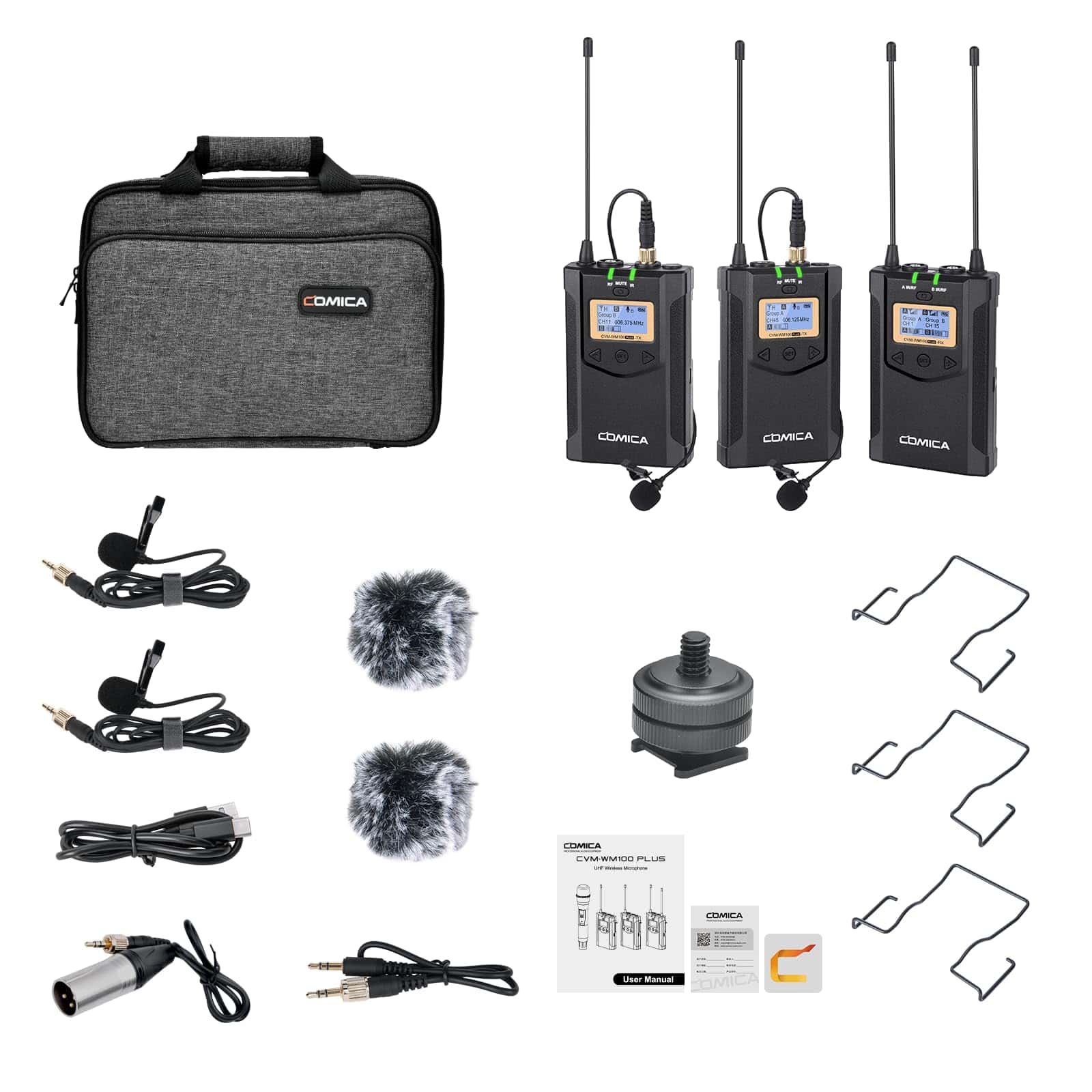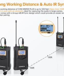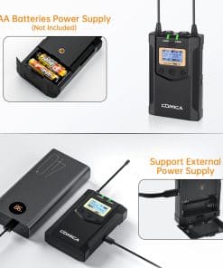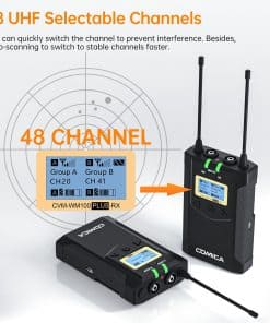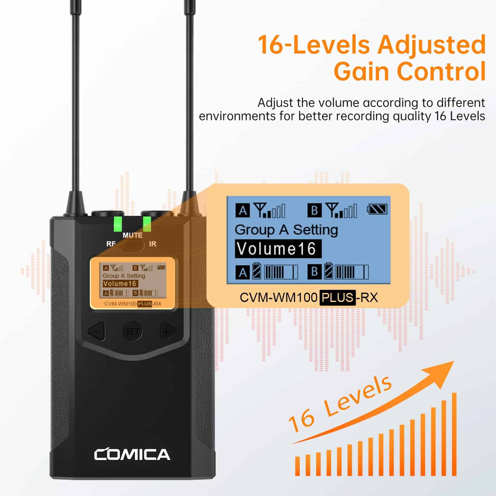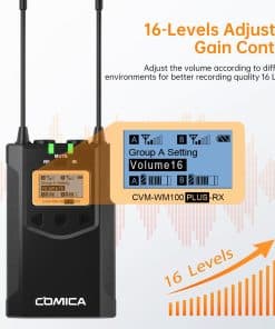 Gracias por adquirir el micrófono inalámbrico COMICA WM100 Plus; WM100 Plus es un micrófono inalámbrico con dos transmisores activados por un receptor, con dos baterías AA. Utiliza tecnología inalámbrica UHF FM y una pantalla LCD de alta resolución, volumen ajustable en 16 niveles, y está integrado con filtro de corte bajo (LCF), coincidencia de canal IR automática, modo de audio conmutable estéreo/mono, ajuste de la fuerza de señal RF, selección dual de entrada MIC/LINE IN, monitoreo de energía en el extremo receptor, visualización dinámica de recepción de sonido, ajuste de retroiluminación, y otras funciones, al mismo tiempo con un fuerte rendimiento de anti-ruido, es un micrófono de alta calidad nivel de transmisión; Especificaciones: Transmisor de Lavalier TX: Canal: 48, Duración: 6 horas, Antena: Antena de hilo de cuarto de longitud de onda, Radiación parásita: -60dBc, Retardo de sonido: 20ms, Distorsión de audio: 0.5%, Señal/Ruido: 65dB, Socket de entrada de audio: Socket de 3.5 mm, Batería: 2 pilas AA, Alimentación externa: Micro USB 5V/1A, Grupo: A/B, Tamaño: 107 x 66 x 26.1mm, Temperatura de funcionamiento: 0 ~ +50, Temperatura de almacenamiento: -20 ~ +60. Receptor RX: Canal: 48, Duración: 6 horas, Señal/Ruido: 65dB, Antena: Antena de hilo de cuarto de longitud de onda, Sensibilidad: -90dBm, Retardo de sonido: 20ms, Distorsión de audio: 0.5%, Respuesta de frecuencia: 20Hz~18KHz, Socket de salida de audio: Socket de 3.5mm, Batería: 2 pilas AA, Alimentación externa: Micro USB 5V/1A, Tamaño: 107 x 66 x 26.1mm, Temperatura de funcionamiento: 0 ~ +50, Temperatura de almacenamiento: -20 ~ +60.