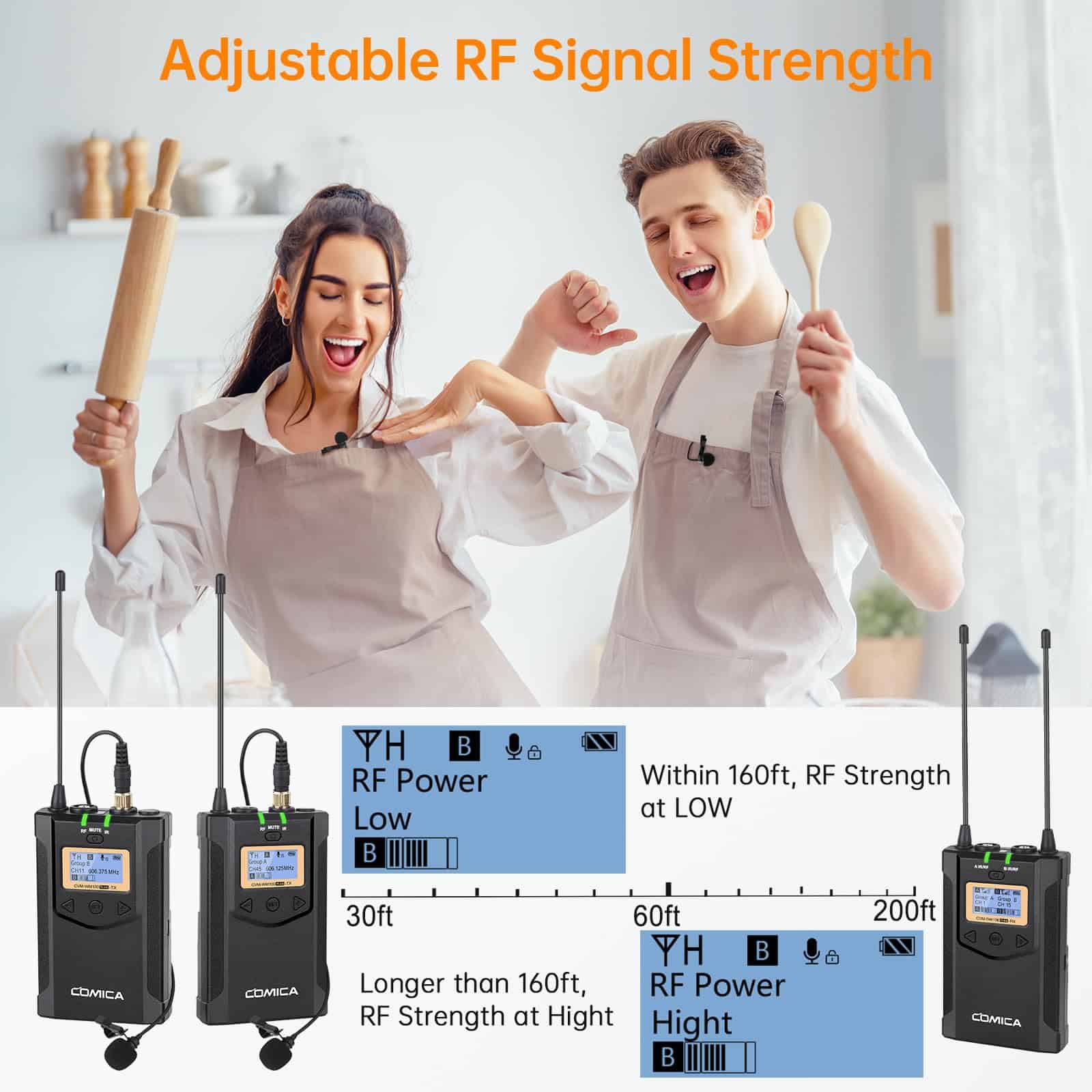 1. 48 canales UHF seleccionables con interruptor rápido de canal para evitar interferencias. 2. Sistema de Doble Canal y Modo Mono/Stereo para fácil post-procesamiento del audio. 3. Supervisión en tiempo real y función de silencio con un botón. 4. Reducción de ruido y baja latencia. 5. Pantalla LCD de alta resolución con monitorización en tiempo real de la batería y volumen. 6. Ajuste de la fuerza de señal RF para mejorar la calidad de audio.