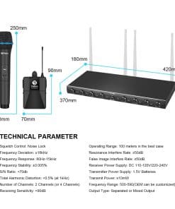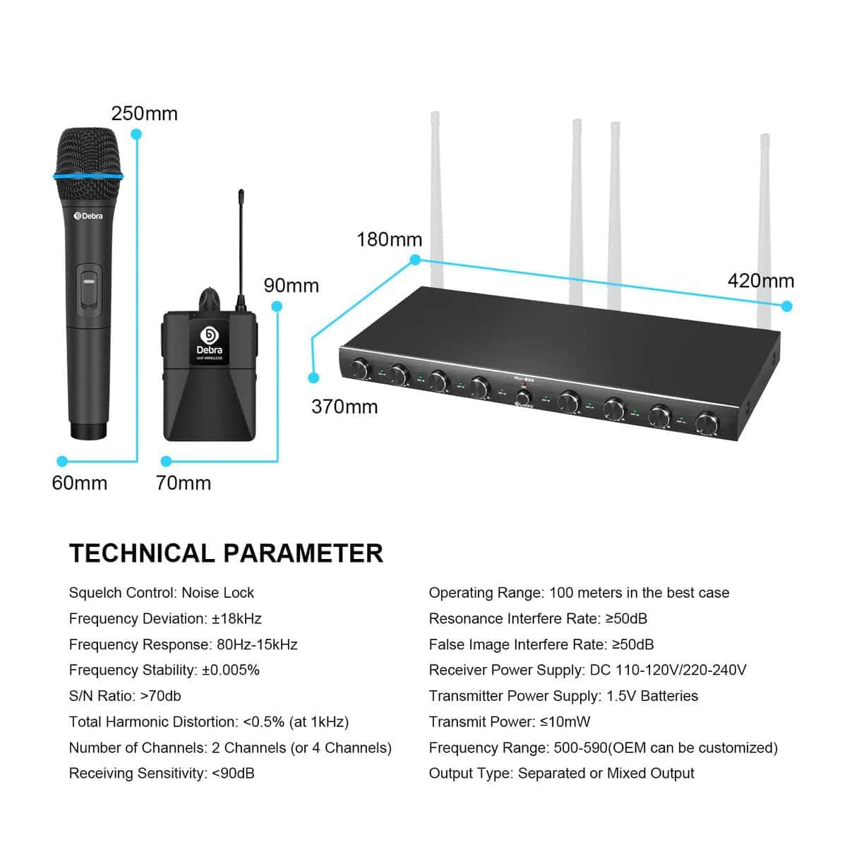 Esta sistema de micrófono inalámbrico AU800 Pro UHF de D Debra Audio ofrece un rendimiento excepcional y versatilidad para una variedad de aplicaciones. Con 8 canales para elegir, podrás experimentar una transmisión de audio estable y de alta calidad en cualquier escenario. Los micrófonos de mano y de diadema incluidos brindan flexibilidad para adaptarse a tus necesidades. El receptor metálico resistente garantiza durabilidad y fiabilidad. Ya sea que estés en una iglesia, un pequeño concierto de DJ KJ, una fiesta de cumpleaños o boda, una conferencia o simplemente disfrutando de una noche de karaoke en casa, este sistema de micrófono inalámbrico es la elección ideal para garantizar un sonido claro y nítido en cada ocasión.