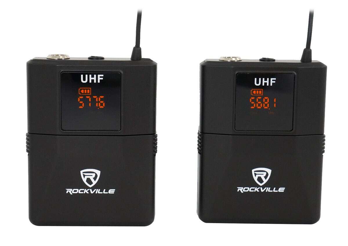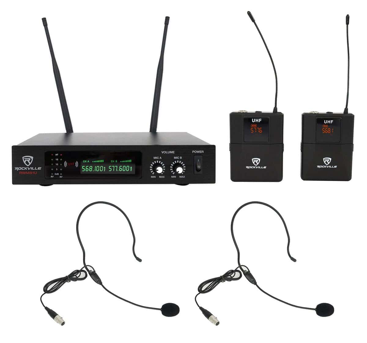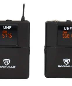 Sistema de Micrófono Inalámbrico de Diadema Rockville RWM81U Dual UHF. Incluye transmisor con dos micrófonos de diadema cardioide unidireccionales inalámbricos de alta sensibilidad.