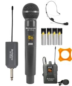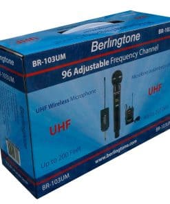 El sistema de micrófono inalámbrico Berlingtone BR-103UM cuenta con un canal UHF que ofrece 30 frecuencias ajustables por cada canal, para un total de 60 canales disponibles. Viene con un estuche de aluminio para el receptor y batería de litio integrada en el receptor. Incluye un micrófono de mano dinámico, un transmisor de cuerpo de bolsillo y un transmisor de micrófono (con un clip de corbata y un micrófono de diadema). La operación inalámbrica se logra con cuatro baterías AA de 1.5V, que vienen incluidas. El rango de frecuencia del canal del micrófono inalámbrico es de 470-580MHz, con un alto rendimiento de relación señal-ruido. El rango de operación es de más de 200 pies en línea de visión. Viene con un manual y una tarjeta de garantía. Incluye un estuche de aluminio, filtro pop acústico, respuesta en frecuencia ultra-amplia, alto salida de señal para voces y canto, construcción resistente y rejilla de malla de acero, circuitación de bajo ruido integrada. Es perfecto para actuaciones en escenario o en estudio. El elemento/tipo de micrófono es dinámico, con una captación/patrón polar unidireccional, respuesta en frecuencia del micrófono de 30Hz-18KHz y sensibilidad del micrófono de -90dB (+/-).