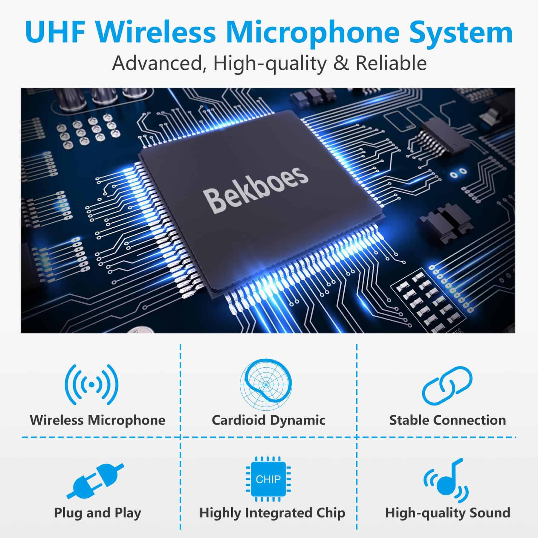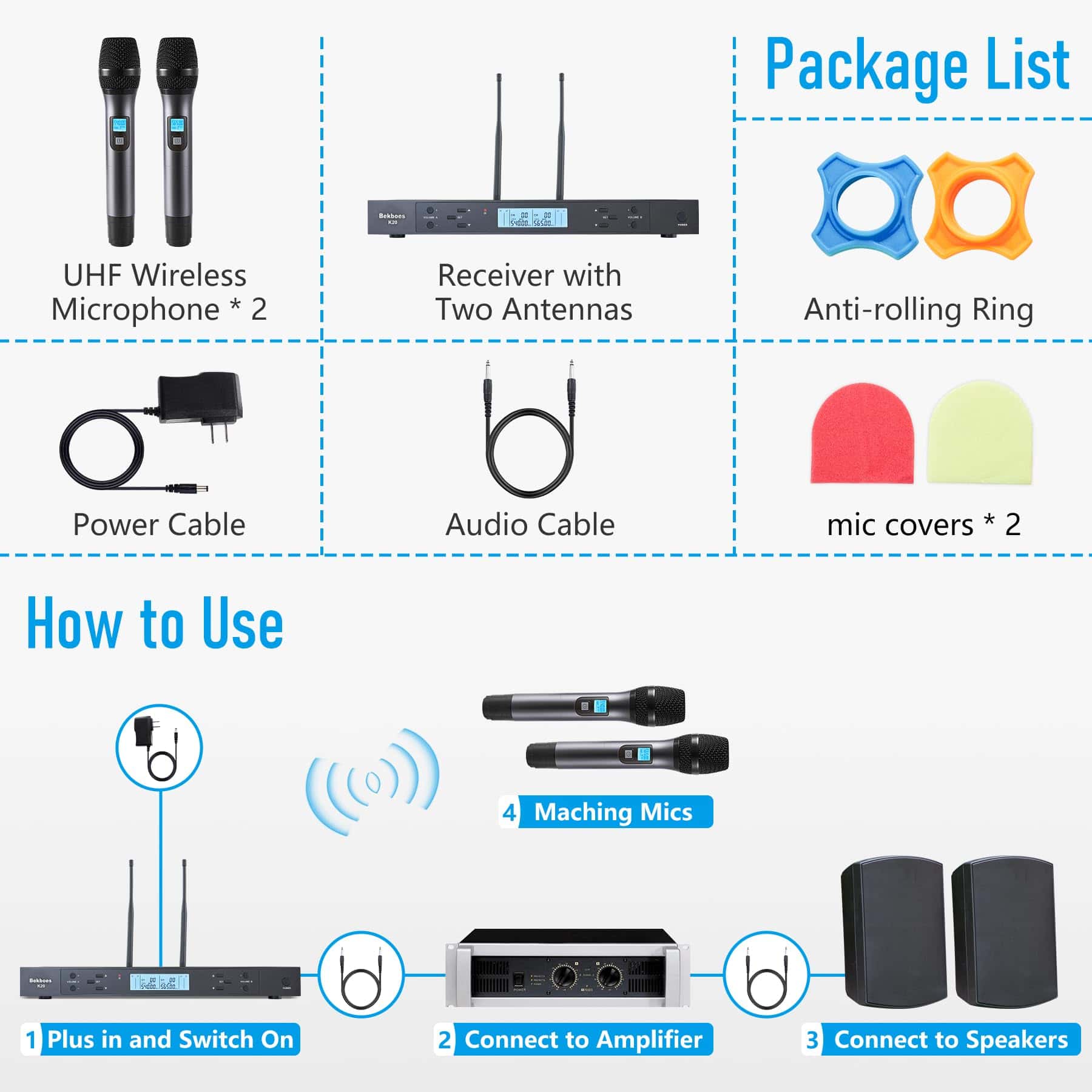 1. Sistema de Micrófono Inalámbrico UHF: Experimenta lo último en tecnología de micrófonos inalámbricos con nuestro sistema dual UHF. Con 200 canales seleccionables y bandas de frecuencia de 536.000-565.700MHz y 566.000-595.700MHz, nuestro sistema de micrófono inalámbrico de mano garantiza conexiones estables, eliminando cortes, siseos y ofreciendo una calidad de sonido cristalina. 2. Micrófono Dinámico Cardioide Unidireccional: El diseño de bobina dinámica cardioide de nuestro sistema de micrófono inalámbrico permite una perfecta recepción del sonido frontal, filtrando el ruido no deseado de otras direcciones. Esto resulta en voces claras y detalladas, eliminando eficazmente el ruido de fondo y los comentarios para una experiencia de audio incomparable. 3. Estabilidad de Señal Mejorada y Rango de Conexión de 164ft: Este sistema de micrófono inalámbrico UHF cuenta con un impresionante rango de conexión de 492ft (150m), asegurando conexiones de señal estables con chips de conexión mejorados. Dile adiós a las conexiones interrumpidas y disfruta de una transmisión de audio sin interrupciones. 4. Conexión Fácil y Plug & Play: El sistema de micrófono inalámbrico cuenta con emparejamiento automático IR por infrarrojos, ofreciendo conexiones simples con un solo botón. La función de búsqueda automática asegura la frecuencia y banda más limpia, lo que lo hace perfecto para conferencias, discursos, podcasts web, clases de yoga, eventos religiosos, reuniones familiares, ceremonias de inauguración, clases de baile, promociones y más. 5. Control de Volumen Independiente para Micrófonos Duales: El sistema de micrófono inalámbrico dual ofrece la conveniencia de ajustar el volumen de salida de cada micrófono de forma independiente, asegurando el equilibrio perfecto y el nivel de sonido para tus necesidades específicas. 6. Construcción Metálica Duradera y Agarre Cómodo: Construidos para durar, los micrófonos inalámbricos UHF cuentan con componentes metálicos, una rejilla de malla de acero y un diseño resistente a la corrosión. El agarre cómodo y el peso equilibrado garantizan horas de uso sin fatiga, lo que los hace perfectos para cualquier evento. 7. Pantallas LCD: Tanto el micrófono UHF como el receptor vienen equipados con pantallas LCD claras, mostrando información de frecuencia, banda y conexión. Realiza un seguimiento de la vida restante de la batería. Con un diseño compacto y portátil, nuestro sistema de micrófono inalámbrico es perfecto para su uso sobre la marcha en cualquier ocasión. 8. Qué Recibes: Receptor 1, Antena 2, Micrófono Inalámbrico 2, Anillo Antideslizante 2, Adaptador de Corriente 1, Cable de 6.35 mm a 6.35 mm 1, Cable de 3.5 mm a 3.5 mm 1, Manual del Usuario 1.