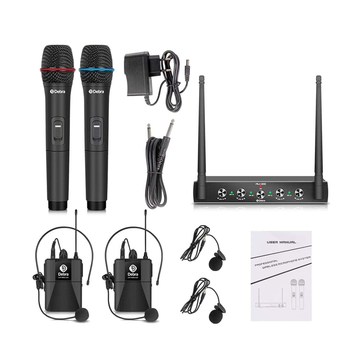 Sistema de Micrófono Inalámbrico Debra Audio Pro UHF de 4 Canales con Micrófonos Inalámbricos de Mano, Lavalier, Receptor Metálico, Ideal para Karaoke Iglesia Fiesta (con 2 de Mano y 2 Bodypack (B)).