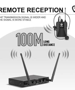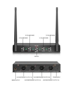 Operación del Sistema Inalámbrico: Sistema de micrófono inalámbrico UHF de cuatro canales para disfrutar de una operación sin cables. Receptor metálico para durabilidad y micrófonos de mano de componentes plásticos de alta calidad para una característica de peso ligero. Control de volumen individual para equilibrar y ajustar precisamente el sonido vocal. Luces LED verdes sobre cada perilla de volumen permiten a los usuarios visualizar la conexión entre el receptor y los transmisores. Las luces LED rojas mostrarían el encendido/apagado. Las luces LED verdes mostrarían la señal de audio. Rendimiento del Sistema: La cápsula de micrófono cardiode permite una fácil captación de sonido y una transmisión de sonido suave, ofreciendo un rendimiento de sonido verdadero y claro de última generación. La señal UHF fija estable garantiza una operación sin interferencias y sin distorsiones, la distancia de funcionamiento es de hasta aproximadamente 300 pies en línea de visión en espacio abierto. Es mejor que todos los sistemas de micrófono inalámbrico VHF. Perfecto para karaoke, reuniones, discursos públicos, entrevistas, karaoke grupal, radiodifusión, iglesia y eventos al aire libre. Simple y fácil de usar: Configuración sencilla del sistema de micrófono inalámbrico y operación conveniente con interruptor de encendido/apagado en el micrófono inalámbrico. El bodypack tiene el control de la perilla para encender/apagar y el volumen. El receptor metálico tiene 4 salidas XLR independientes y una salida de audio de mezclador de 1/4 para conectarse a su amplificador, mezclador u otro sistema de PA. Lista en el paquete (opción 4 Bodypack): 1 receptor inalámbrico UHF 4 micrófonos Lavalier 4 micrófonos de diadema 4 bodypack 1 cable de audio de 1/4″ 1 adaptador de corriente AC/DC 1 manual de usuario (inglés)