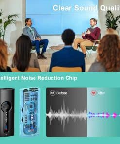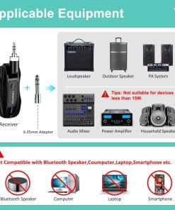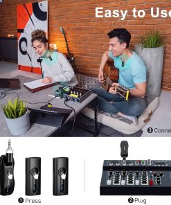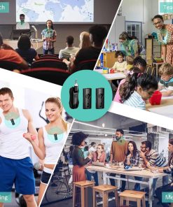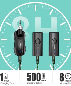 Sistema de micrófono inalámbrico dual KIMAFUN, compacto micrófono de solapa para orador, cámara, profesor, G70-1(2TX1RX). Este sistema de micrófono de solapa inalámbrico dual es ideal para su uso en situaciones donde se requiere la captación de sonido de dos personas para ser reproducido por el mismo altavoz. El receptor también tiene la capacidad de emparejarse con un solo transmisor. Es un sistema versátil que se puede utilizar en entornos como enseñanza, entrenamiento, salones de clases, bodas, entrevistas, entre otros. La operación es sencilla ya que simplemente presionando un botón se puede emparejar automáticamente y conectar el receptor al altavoz para comenzar a usarlo, sin necesidad de utilizar bluetooth. El transmisor cuenta con un micrófono incorporado que puede captar el sonido de forma directa, y también tiene la posibilidad de conectarse a un micrófono externo de 3.5mm. Con un impresionante rango de transmisión de audio de hasta 165 pies en línea de visión directa, este sistema ofrece flexibilidad de movimiento mientras se está utilizando. La duración de la batería es de hasta 8 horas después de una carga completa de 1 hora, y el indicador de batería le mantendrá informado sobre el progreso de la carga y la cantidad de batería restante. Además, cuenta con un modo de silencio que permite silenciar de forma independiente los transmisores, así como controlar el nivel de volumen. Este sistema es compatible con altavoces públicos, mezcladores, amplificadores de potencia, cámaras y otros equipos que tengan entrada de 3.5mm/6.35mm (1/8» o 1/4»). Sin embargo, no es compatible con teléfonos móviles, computadoras, o altavoces pequeños que únicamente tengan función Bluetooth.
