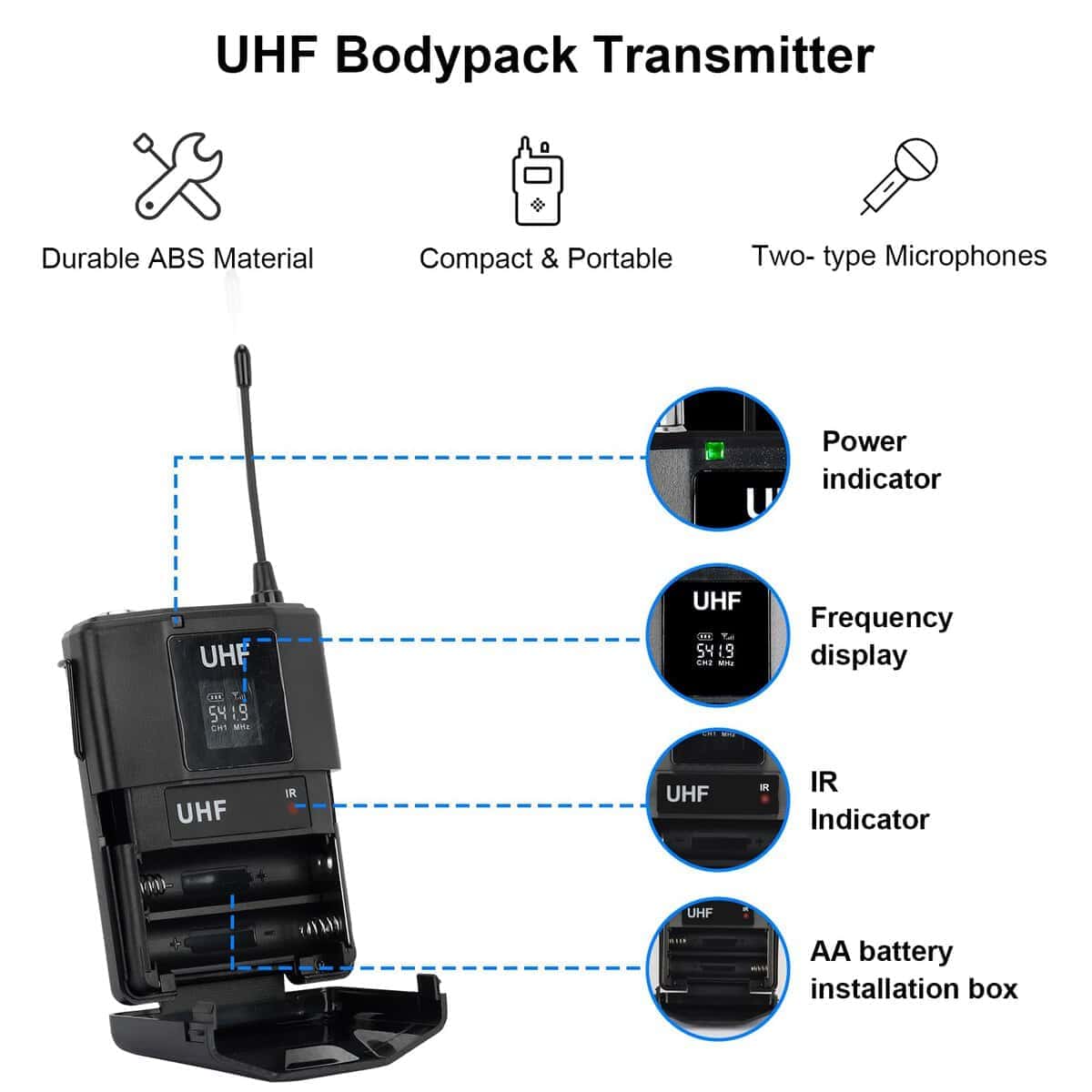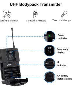 1. Material resistente: carcasa de ABS de alta calidad diseñada especialmente para resistir impactos y corrosión. El transmisor de bodypack cuenta con controles de volumen independientes, 2 micrófonos de solapa, es ligero y compacto, dándote la libertad de viajar a cualquier ubicación de trabajo.