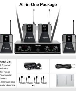 5. Lo que obtienes: Flygrow ofrece un servicio de experiencia de compra sin complicaciones, si encuentras algún problema antes o durante el uso, no dudes en contactarnos. Lista de empaque: 1 x receptor inalámbrico UHF, 4 x bodypack, 4 x micrófono de solapa, 1 x adaptador de corriente, 1 x cable de audio de 6.35 mm, 2 x antena, 1 x manual de usuario. Nota: las pilas AA no están incluidas.