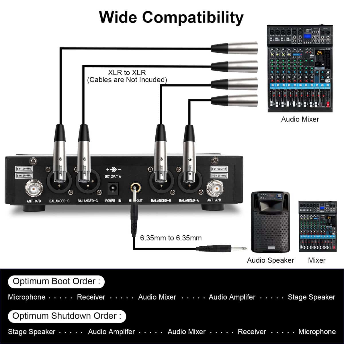 3. Uso multifuncional: nuestro receptor funciona hasta 250 pies a la vista en espacios abiertos. Ideal para conferencias, transmisiones, bodas, karaoke, eventos sociales y cualquier lugar pequeño a mediano como salas de conferencias, auditorios, escuelas, iglesias y pequeños escenarios. Disfruta de un viaje musical ilimitado con este sistema de micrófono.