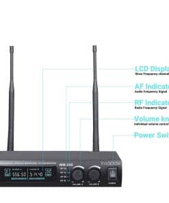 Sleek metal housing with internal antenna for optimum aesthetics and long life. Battery Life: 14-17 Hours. Working Range in wide-open area: 150-200Ft. Extra Two XLR individual outputs and one 1/4″/6.35mm Mixed output.